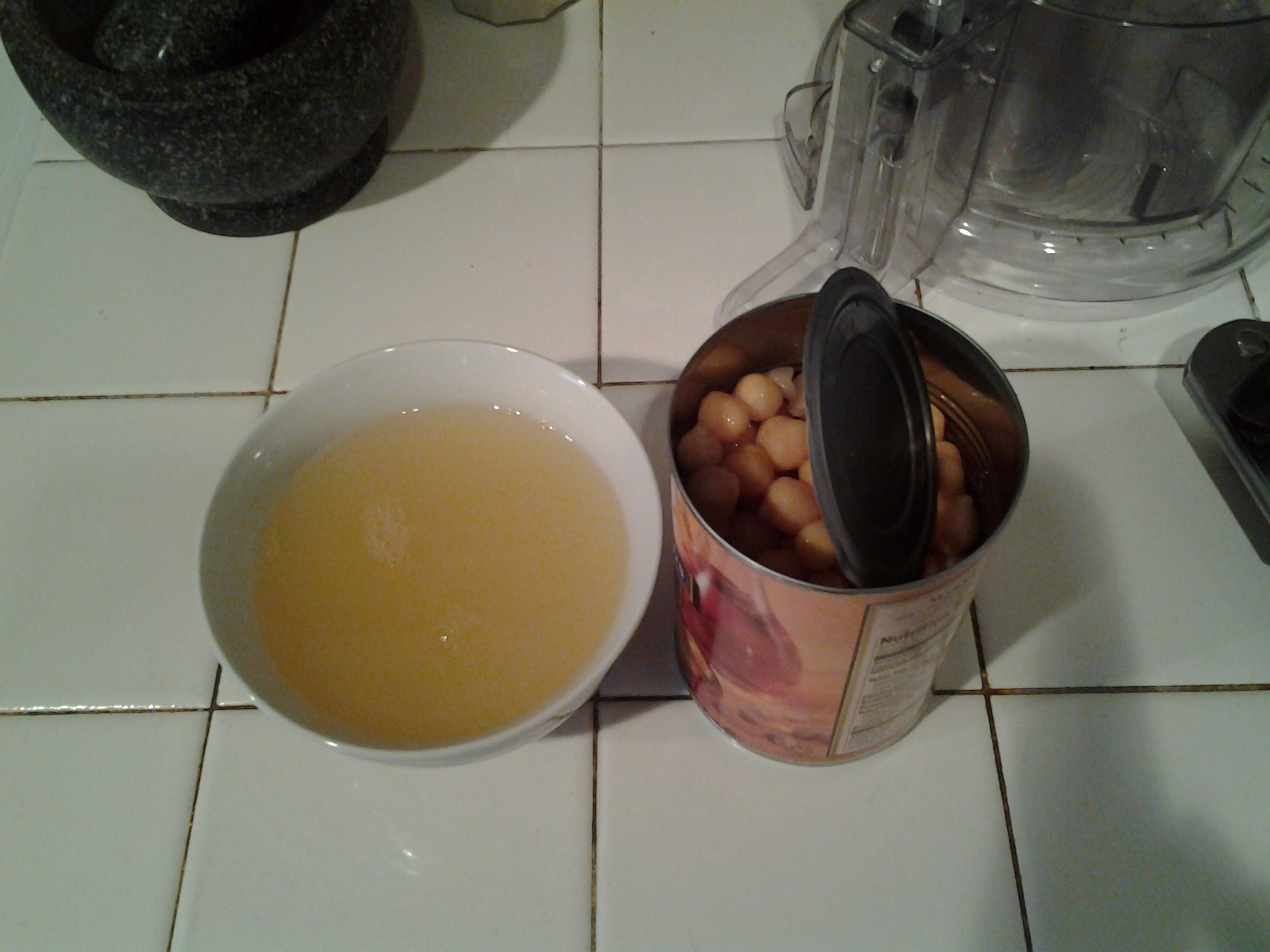 Okay, my no. 1 tip. When you take the chickpeas out of the can, DON’T throw away the liquid they come in. That is your secret weapon! Keep in a bowl, like this: