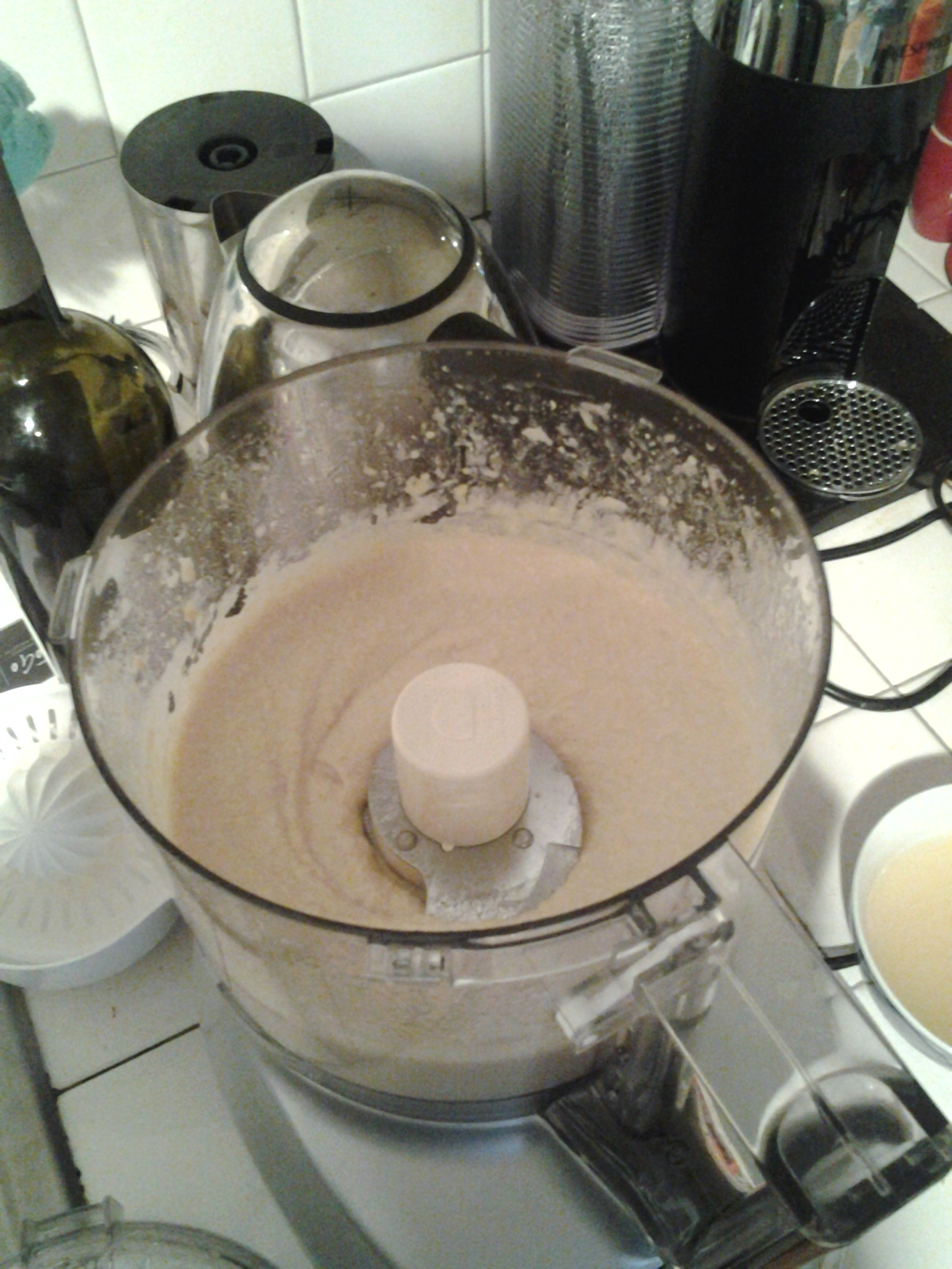 Then simply pop the chickpeas, garlic, tahini, lemon juice and salt in a food processor and whizz away: