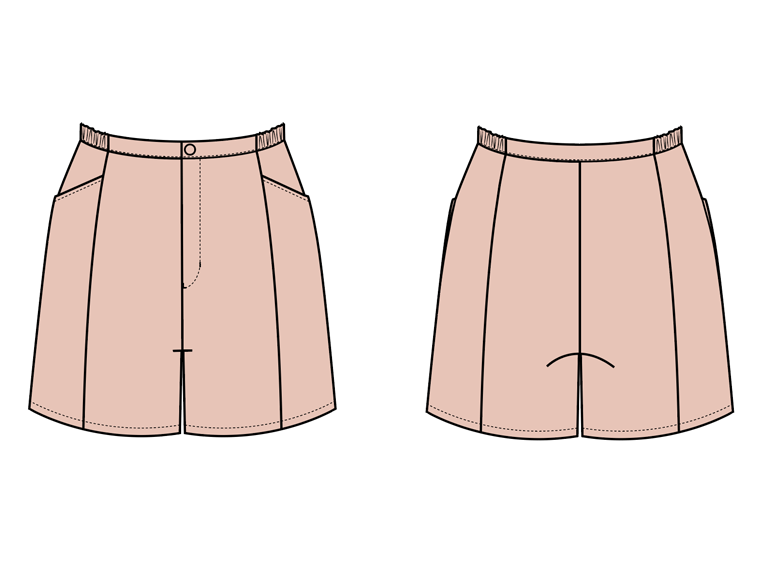 First, the patterns. I was initially attracted to the Dorian shorts and quite excited, too. I thought the design looked promising, with a clever mixture of flat waistband and elasticated waistband panels to give comfort, but still a retention of slender style lines. Many of the trousers or skirts I’ve made with a flat/elasticated mixture have a flat front and then elastic waistband, but sometimes that can add to the butt or (in my case) hips in a way I’m not going for.