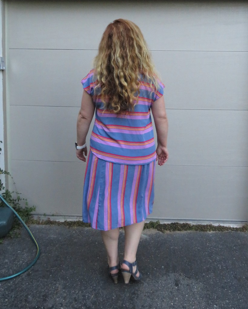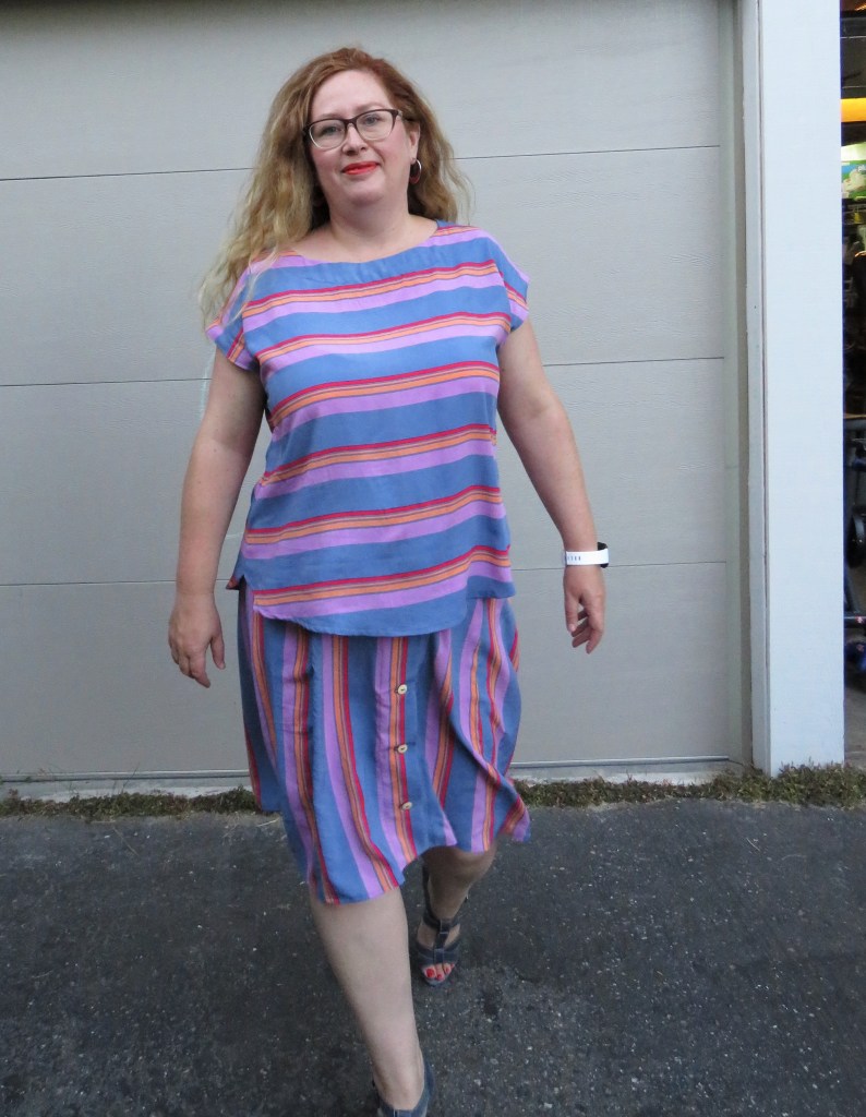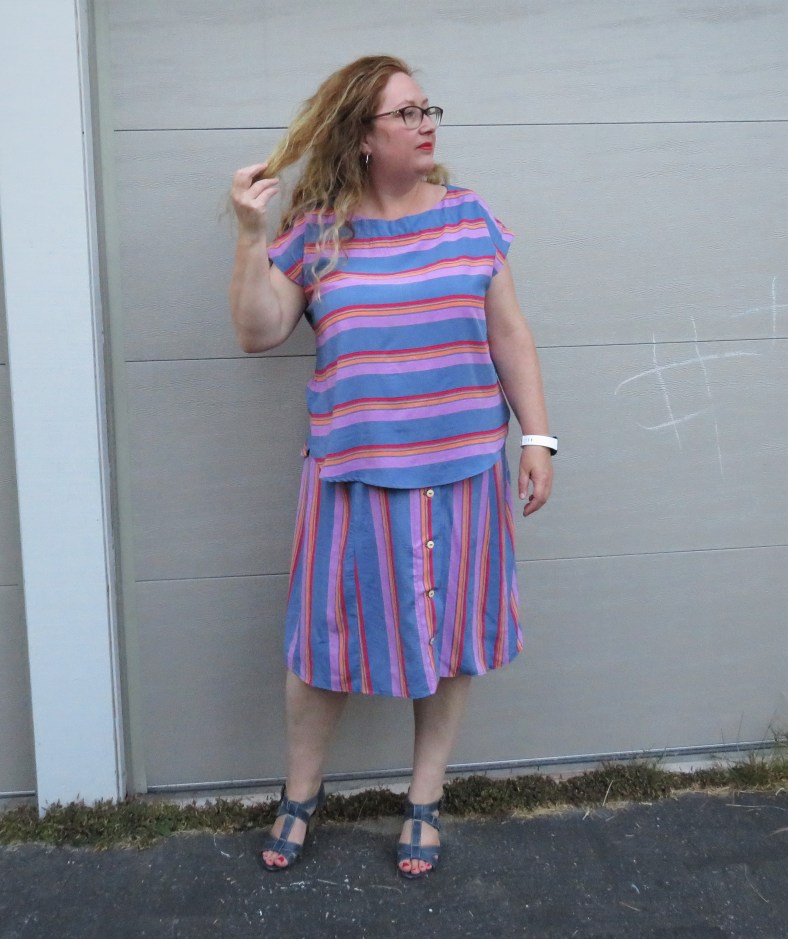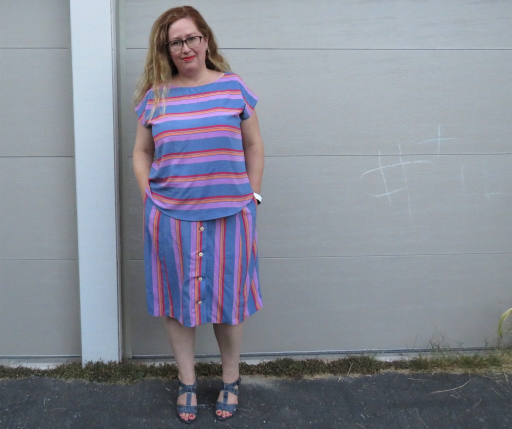 Such is the case for Seamwork’s Sawyer skirt, one of the new September patterns. As I said to Meg at Seamwork when she sent through the previews, I had just pulled out a bunch of midi skirt patterns from my stash as I had exactly this garment in mind for a two-piece late summer outfit and – bam- Seamwork read my mind. I knew exactly which fabric I was using too: this beautiful striped rayon challis I bought from the lovely La Mercerie just before they stopped selling fabric. Can you believe I got both garments comfortably out of 3 yards? Not bad, eh?