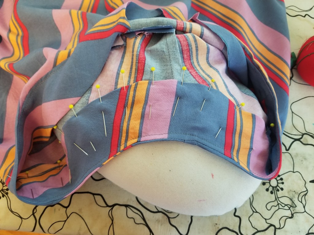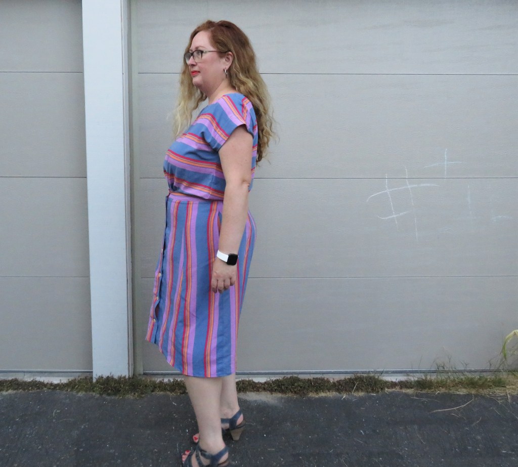 While grey is not my best colour, this is a deep blue-lilac/grey, which just edges into my preferred colour palette and the bright accent red, pink and tangerine are absolutely great colours for me. I also knew that I wanted to contrast the stripes a little, to avoid looking like a rayon deckchair. I toyed with the idea of cutting the skirt on the bias to get a nice chevron, but since it’s a placket/button front I didn’t think it would be as effective. I settled for a horizontal vs vertical contrast and so cut the skirt on the crossgrain. It was wide enough that I could do that easily. Since the pattern pieces aren’t all straight-edged, it was impossible to get a consistent pattern the entire way round, but it’s still quite pretty.