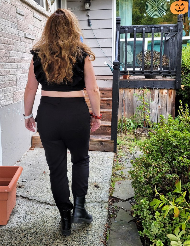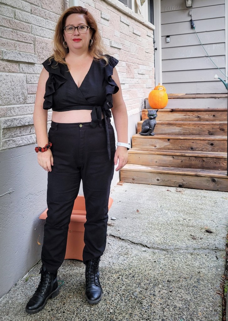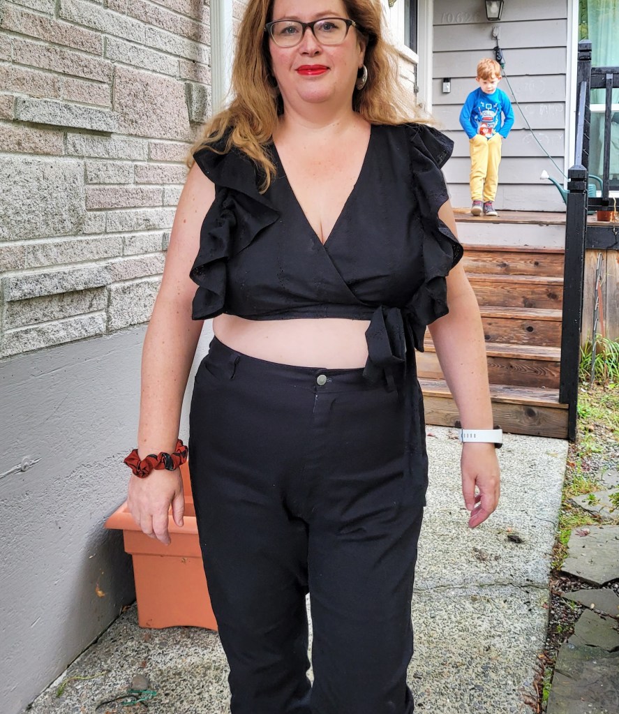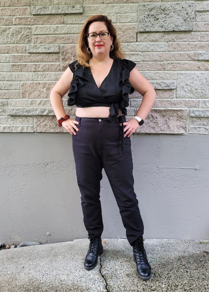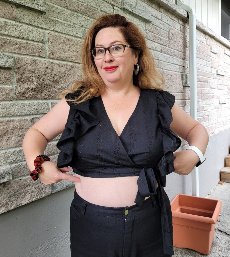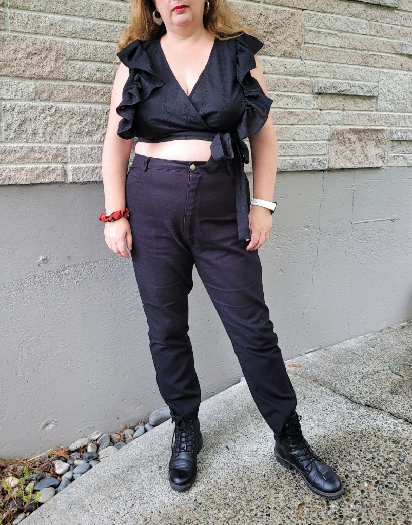 Of course, I need a bit more length in general, so I would definitely widen the waistband too I think – maybe double it, or more! I would prefer the crop to reach at least my high waist, but maybe even my natural waist. To put it in perspective, I’m wearing my high-waisted Dawn jeans here, which I added an inch of height to! I made the 18D cup Flor Top, which matches my measurements fairly closely, but I would grade out to the 20 below the bust next time.