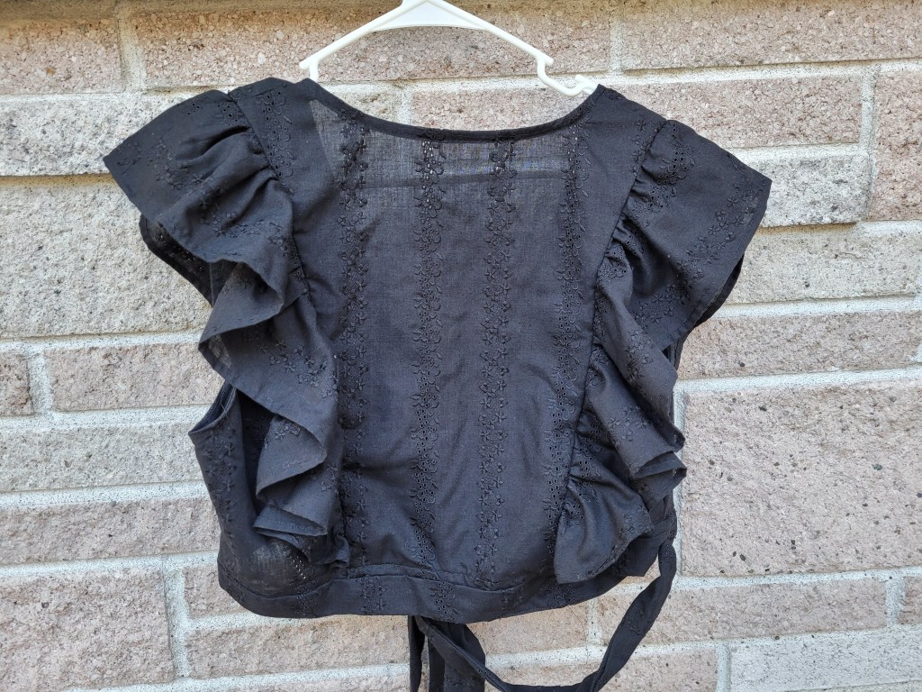 Doesn’t it look pretty on the hanger? This is the Flor Top/Dress from designer Bella Loves Patterns, who are based out of London. As you can see, it’s quite a dramatic design, with big flouncy ruffles and a distinct silhouette. The dress version was just a little too flouncy for me, so I knew from the get-go I would make the top and also exactly which fabric I’d use. I was delighted on holiday in September to get a chance to pass through Missoula again and pop into The Confident Stitch. I went in primarily to buy some fabric for one of the many tests I’ve been working on (yes, that’s where I’ve been), but while there picked up this black broderie anglaise without any clear idea what to make with it. As luck would have it, I spotted this pattern browsing on Instagram and immediately knew it was THE ONE.
