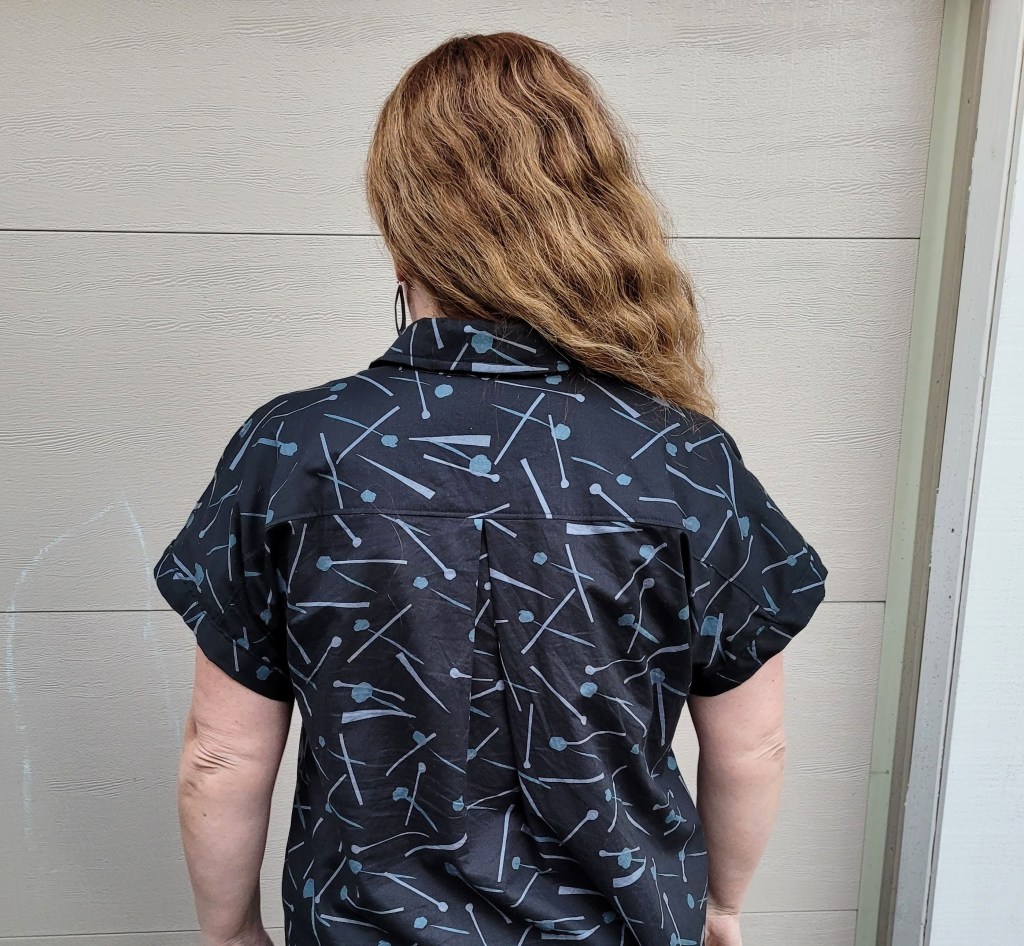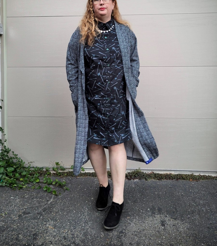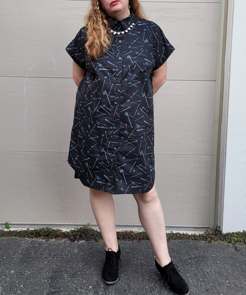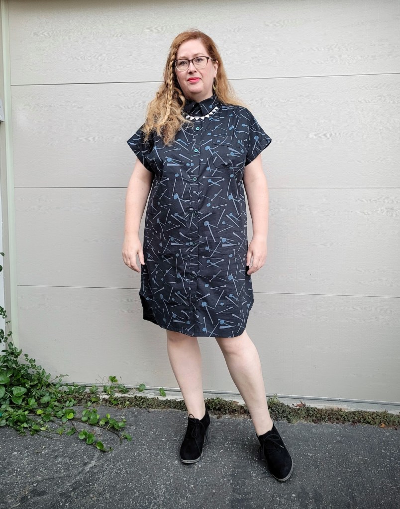 I had a little niggle at the neckline and was getting a few draglines from either side of the neckline downwards when I took the tester photos. However, I took some outdoor photos for the blog today and I can’t see them at all in these pictures, despite the fact I haven’t washed the shirtdress, nor have I gained or lost weight since I finished it, so I have absolutely no idea what happened to them! I do occasionally get these lines on a fitted shirt and I think it’s probably just a little forward neck adjustment I need to make, but I’ll happily take the disappearance-of-the-draglines-for-no-apparent-reason, for now.