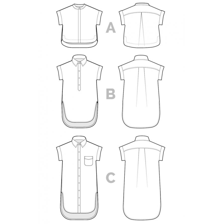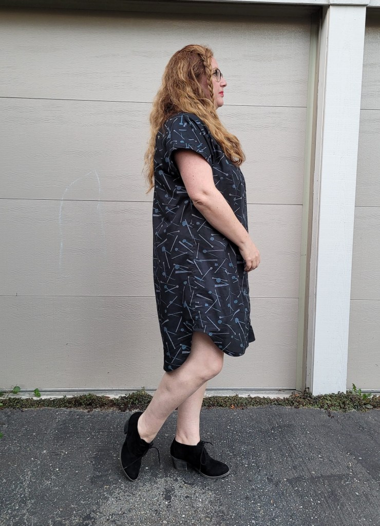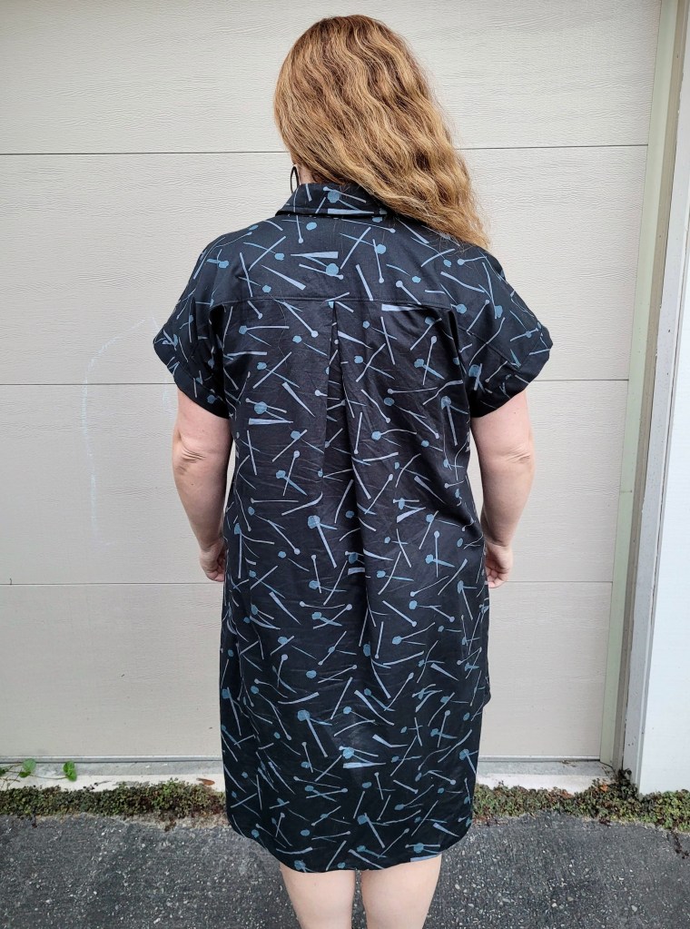 The Kalle has been an extremely popular pattern, so I’m sure you know of it already, but, if not, it’s a fairly boxy woven shirt pattern that comes in three lengths: cropped top, tunic and shirtdress. I made the cropped top last time, but had always wanted to try the other lengths, so this time I made the shirtdress. I also chose the two-piece collar (there is a band collar too) and I decided to go for the inverted pleat at the back, rather than the box pleat I used last time. The new size range goes from 14-30 with a D cup bust, which corresponds to a 42-58″ full bust and a 35-51″ waist. You can check out both ranges here on their website.
