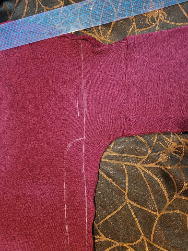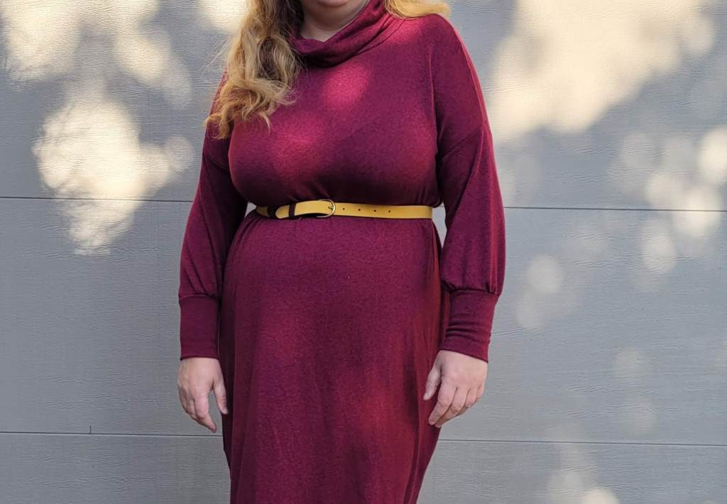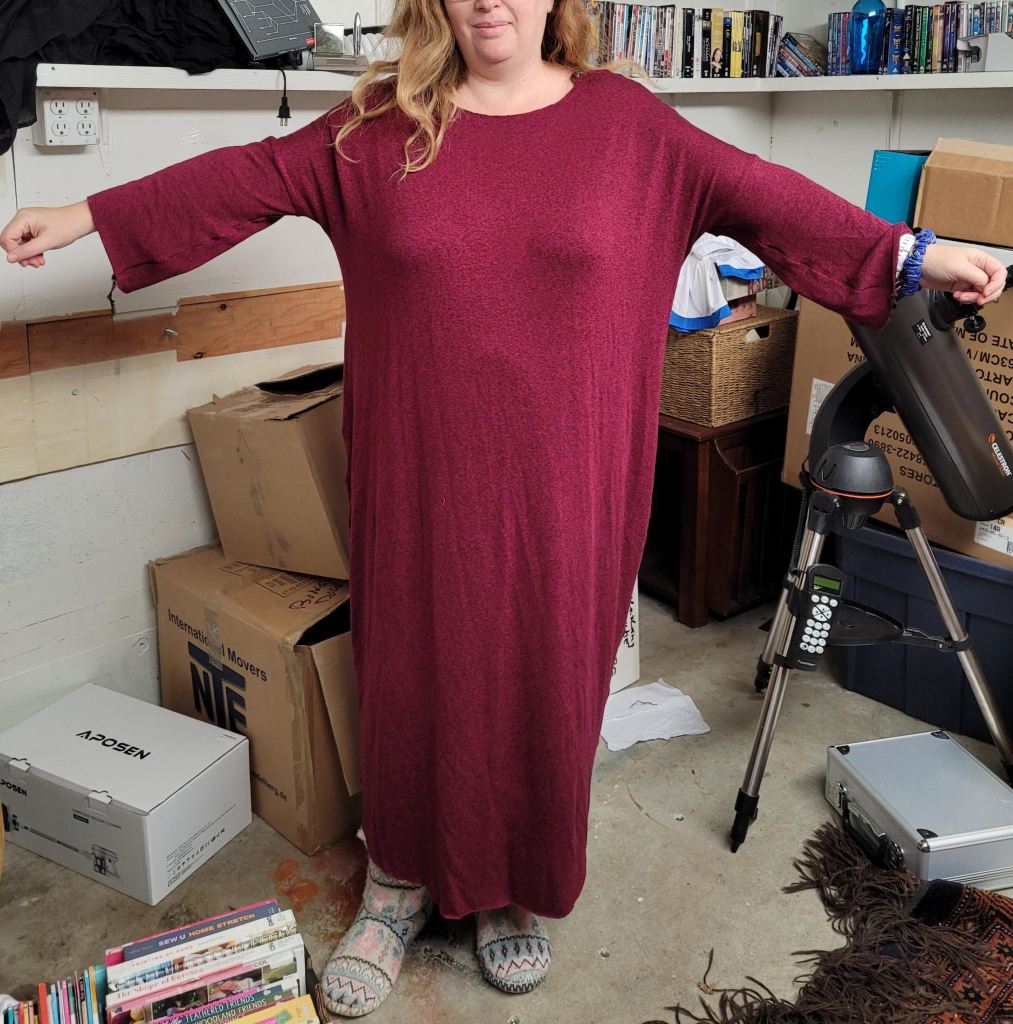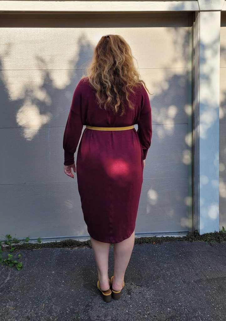 To be honest, it’s hard to tell with this pattern as it’s designed with a TON of ease through it. The curvy range has a bit less ease, which is the main reason I went for it, but the shoulder and sleeve ended up being way too long even so (the armscye was really far down my side), so I had to shorten it a lot. I reckon this was partly because of the fabric I used, which is a gorgeous rayon/modal/cotton blend from Blackbird Fabrics in the earthy sounding “oxblood”. It’s not really, realllyyy drapey like some rayon blends, but still probably a little stretchy for this project as intended. In fact, I notice today that Seamwork advises against this type of knit in the release, so there you are! Nevertheless, with my adjustments, I really like it, so I’m not complaining.