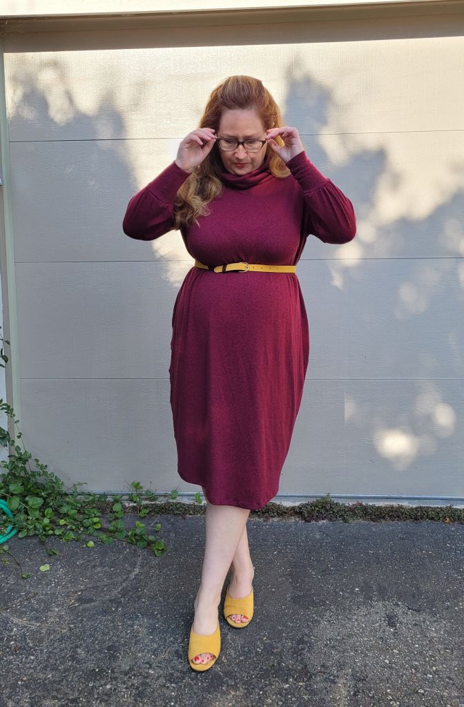 So I really have no idea if the fit is better for me or not, but I will maybe try on a more structured pattern another month. In the end I removed 3 inches from each shoulder, which resulted in about 1.5 inches off each side seam. I also shortened it by 6 inches for a just-below-the-knee finish. It still has a decent amount of ease without the belt and looks rather like the bonus model picture on the Seamwork website. I’m quite sure I’ll end up wearing it like this the most, because it’s so comfy and forgiving, which, after all, is the main thing most of us want in a garment. However, I have to confess that I love it with this mustard belt and shoes, which made me smile when I put it together. I love the colour combo and, needless to say, my husband loves the va-va-voomness of it all.
