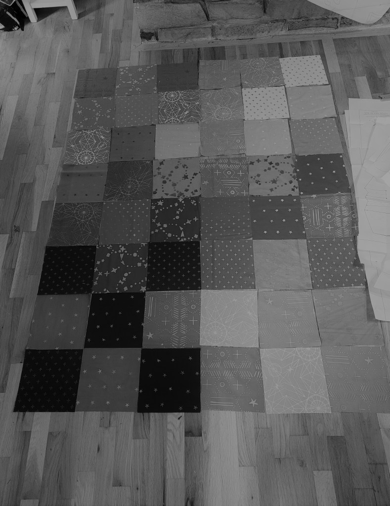 Here’s the final quilt in black and white so you can see the difference in values and saturation. It looks a lot more even to me than my first attempt. It was a really interesting exercise, and I think it will be one of my favourite parts of quilt-making, going forward.
