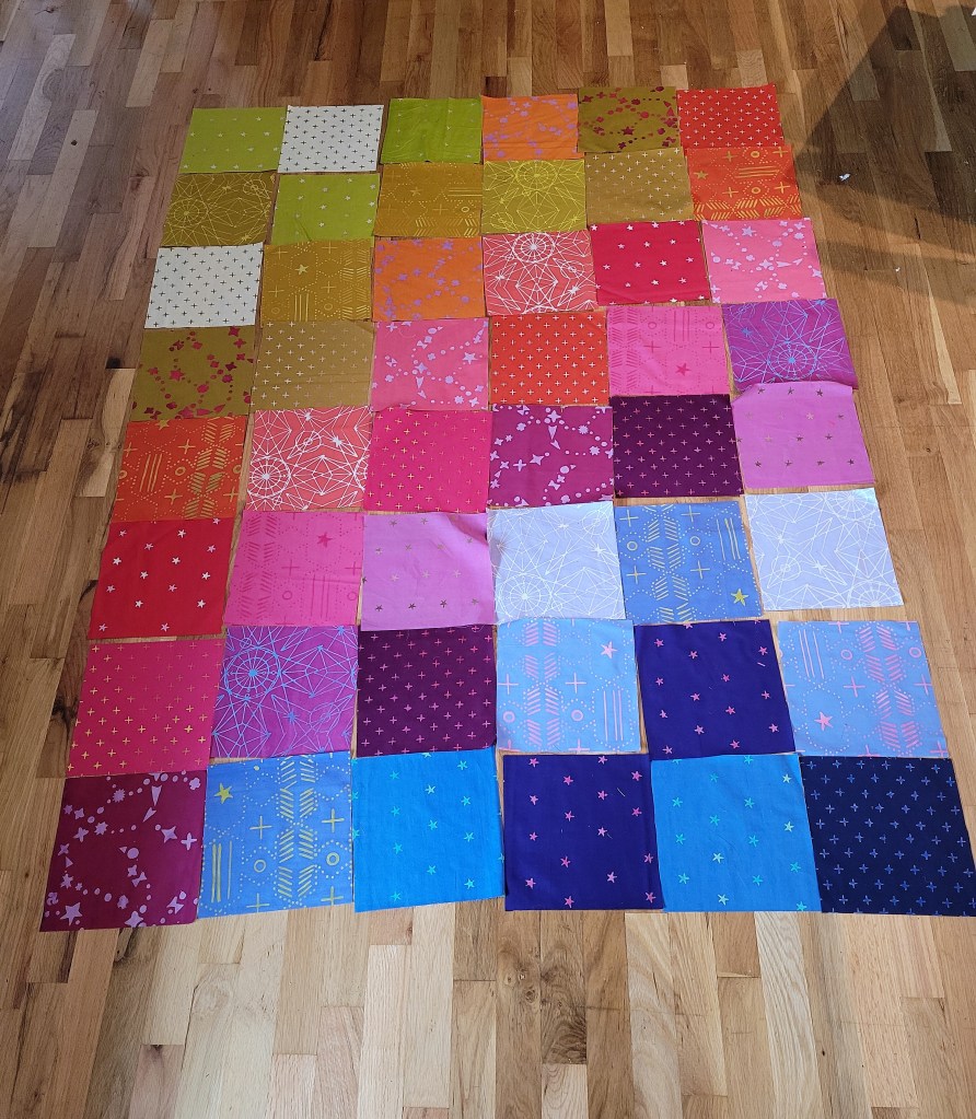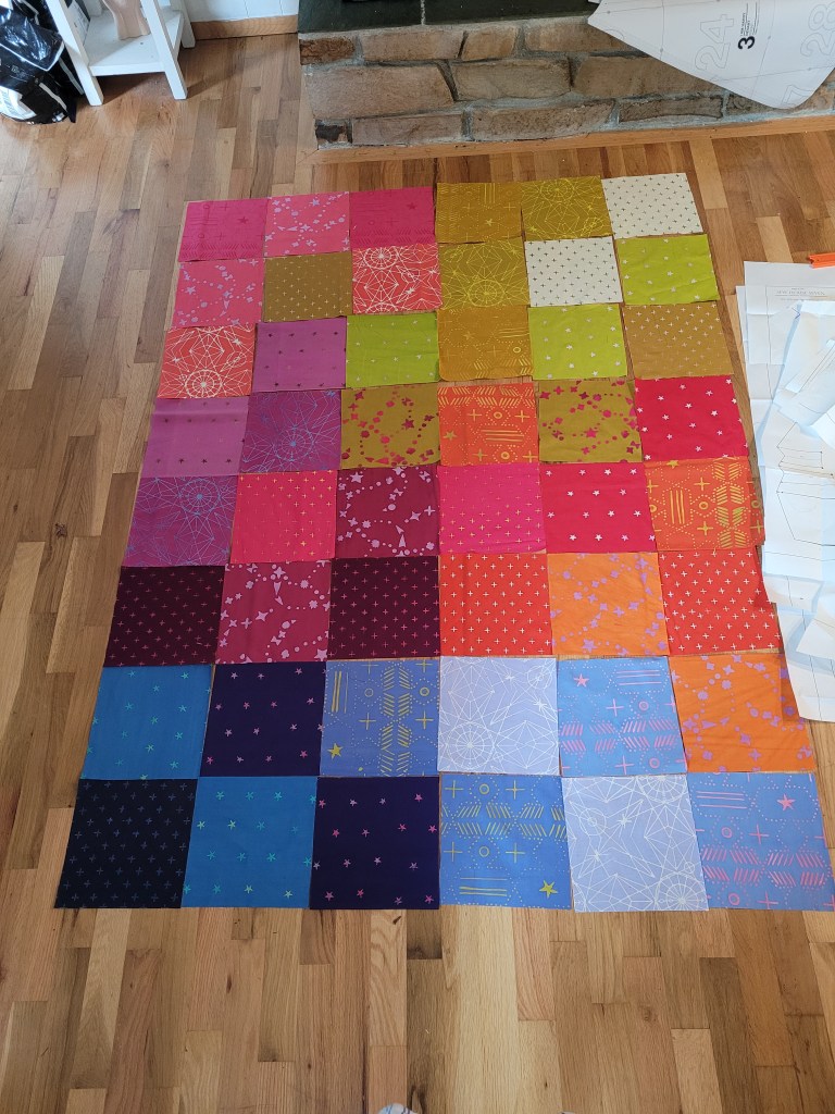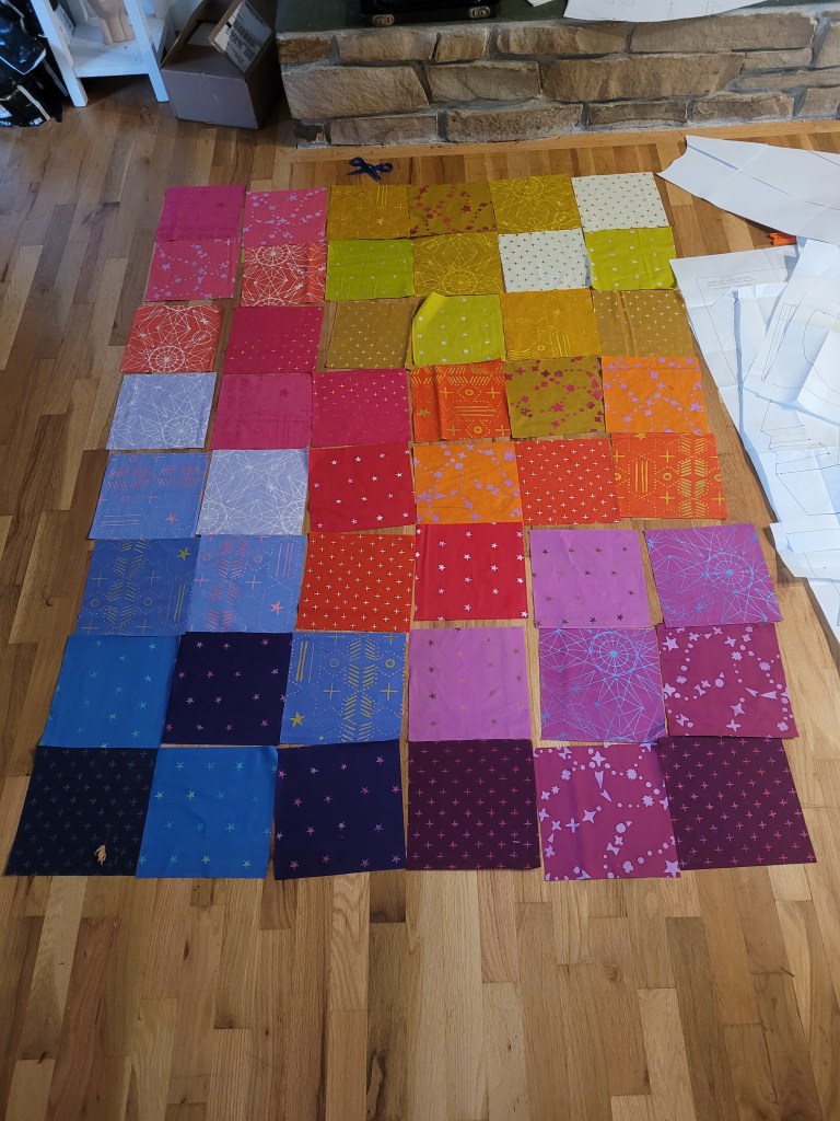 I tried some more layouts – this time I tried to work across and up the quilt a bit more, so I still started with the darker colours and ended with the lighter, but kept the mid-range hues of the reds, oranges and pinks all through the middle. I also tried to spread the deeper, darker squares out a bit, so it wasn’t too concentrated in one area. This looked a lot better to me, but I wasn’t totally happy with the middle part, which got a bit muddy again. Still, this was definitely on the right track.