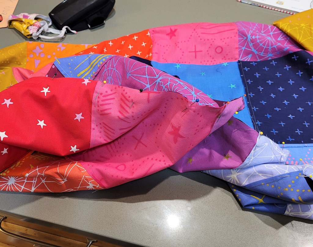 Back to Instagram and more knowledgeable sewing friends! I got lots of good suggestions. Many people suggested using painter’s tape on a wooden floor and this was something I had the space for. It seemed that the consensus was a deep-pile carpet was the source of my issue. I don’t have the best back in the world and some of the suggestions for a solution off the floor made me prick up my ears. One friend uses binder clips on a table, but I didn’t have a suitable table for that. Another uses cutting mats on top of a cutting table and tapes it all up, but my quilt was a little too big for that solution. Sounding like Goldilocks and the Three Bears yet? One last sewing friend talked about using gravity to keep it flat off the edge of a workstation. My husband had suggested that and I had replied that I wasn’t sure it would keep flat when you moved the quilt up and over, but now there was evidence it might…