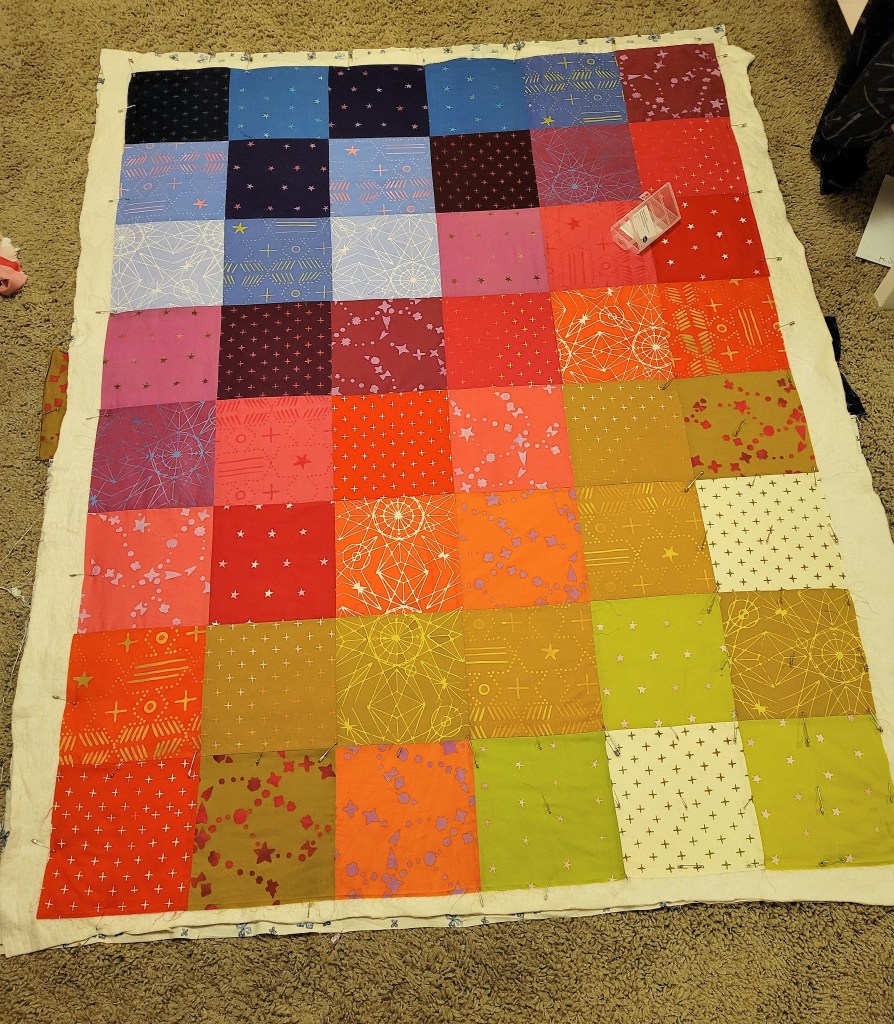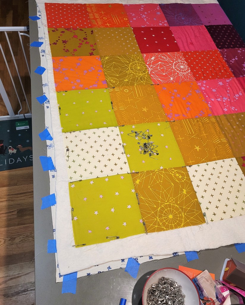 It basically involves pinning your backing to a carpet so it’s taut and fixed. Then you lay the batting and quilt top on top of the backing and pin those layers every 3 inches or so to the backing, trying not to catch the carpet this time. I read somewhere that if you spread your hand out at any point on your quilt and can’t feel at least two pins, you haven’t used enough pins!