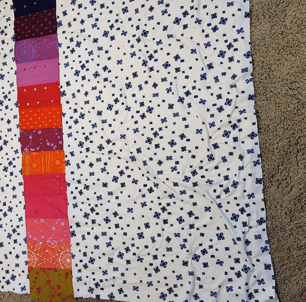 As you can see, I also decided to make a dividing line down the middle with some of the pieces I had left over from the quilt top. This ties the front and back together, but it’s also apparently a good idea not to have a seam down the centre back. As this is where the quilt gets folded most often, it can wear more quickly if there’s a seam there. Makes sense!