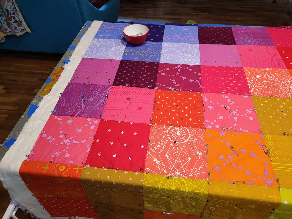 I was surprised how fast this was. Even taking my time to be careful to press and line everything up, the entire quilt top only took a couple of hours. I managed to get pretty neat joins at almost all the intersections, so that made me happy. Next, I needed to arrange the backing. I had this lovely Cotton and Steel quilting cotton in my stash from ages ago and thought the blue and white tile effect would contrast nicely with the bright front. I didn’t realise at the time, but it was also a good choice because it hides all the little mistakes I made really nicely! If I’d chosen a solid backing, those little tucks and puckers would have stood out like a sore thumb.