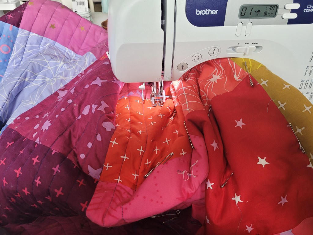 Next – the bit I was most dubious about – the quilting! I spent quite a bit of time figuring out the best way to attempt quilting on my little Brother. There’s only a 5 inch space to push the quilt through on the right hand side, so I was a little apprehensive. I’ve made bags and bulkier items on this machine before and I know it takes a little manhandling. Would I be able to quilt a 64 x 48″ quilt through it? Well, the answer is… mostly. I’m not going to pretend it’s perfect, but the important thing is I’m perfectly happy with it. I might have to experiment a bit more to see if I can get a better finish for any quilt I’m giving as a gift, but for this first attempt it was good!