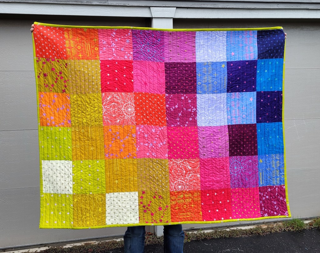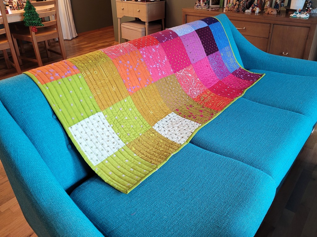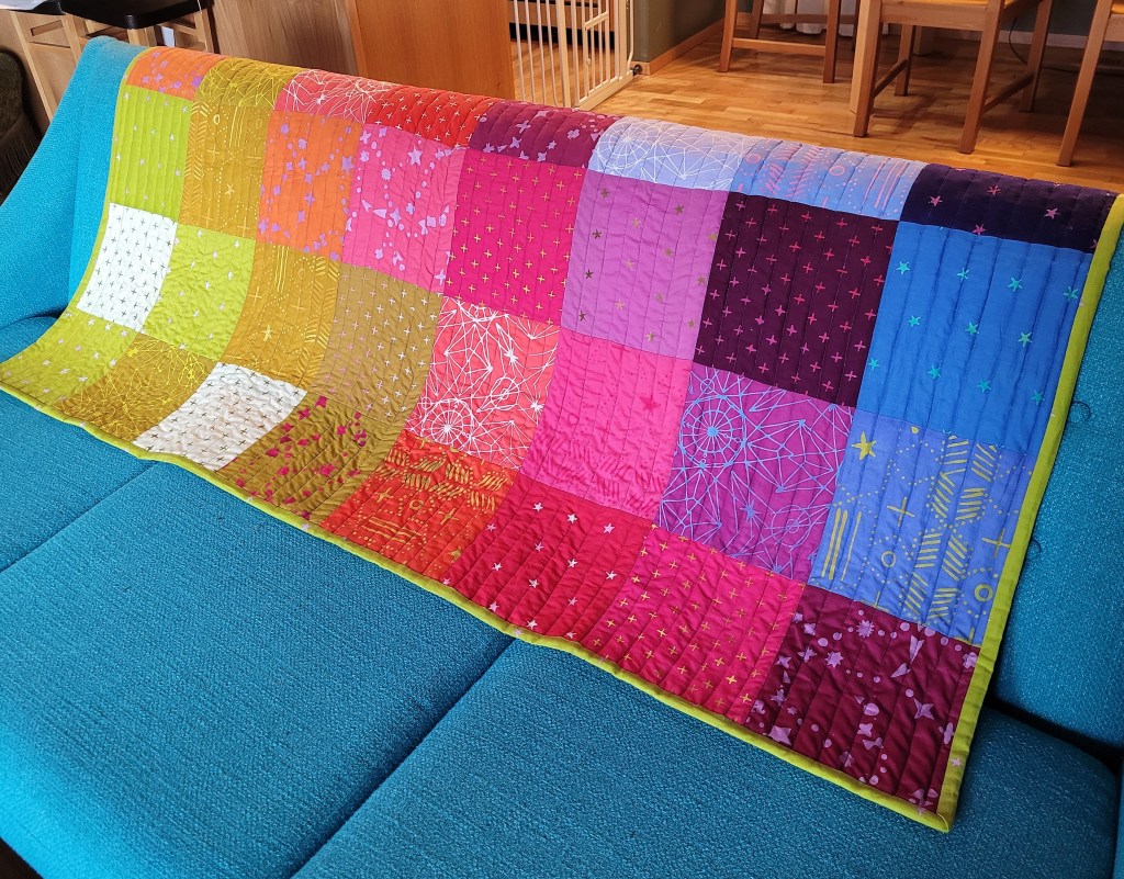 What really led me to actually making one, though, was that I planned to make a quilt to commemorate my parent’s golden wedding anniversary. I picked out a pattern and fabrics – and then realised I neither had a clue where to start, nor the necessary skills to sew such an important gift to a half-decent standard. Covid-19 arrived and during the US Presidential election week, I found myself casting around for something interesting, but not too technical, that I could do sitting in the living room, watching the news, rather than behind the sewing machine. So I came to the idea of a bright, colourful and very simple quilt. I could learn some skills and cheer myself up with the rainbow hues of Alison Glass’ Observatory Collection prints at the same time. Bingo!