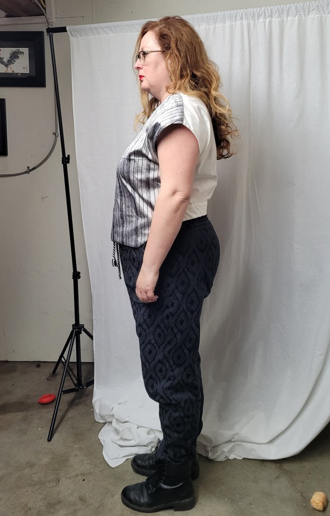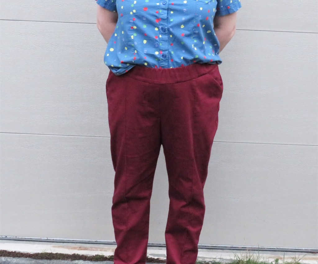 However, I’m calling them a miss because I had a bubblehead moment when making them and went ahead and cut the fabric without checking for my usual adjustments. As you can see above, I should have made quite a few of my usual adjustments, because they’re really short at the front and pull forwards. I end up hiking them up quite a bit. I also had a few issues with the project sizing and instructions (see the post here), but, overall, I wear them a lot. I just don’t know if it would be the first pattern I’d reach for next time.