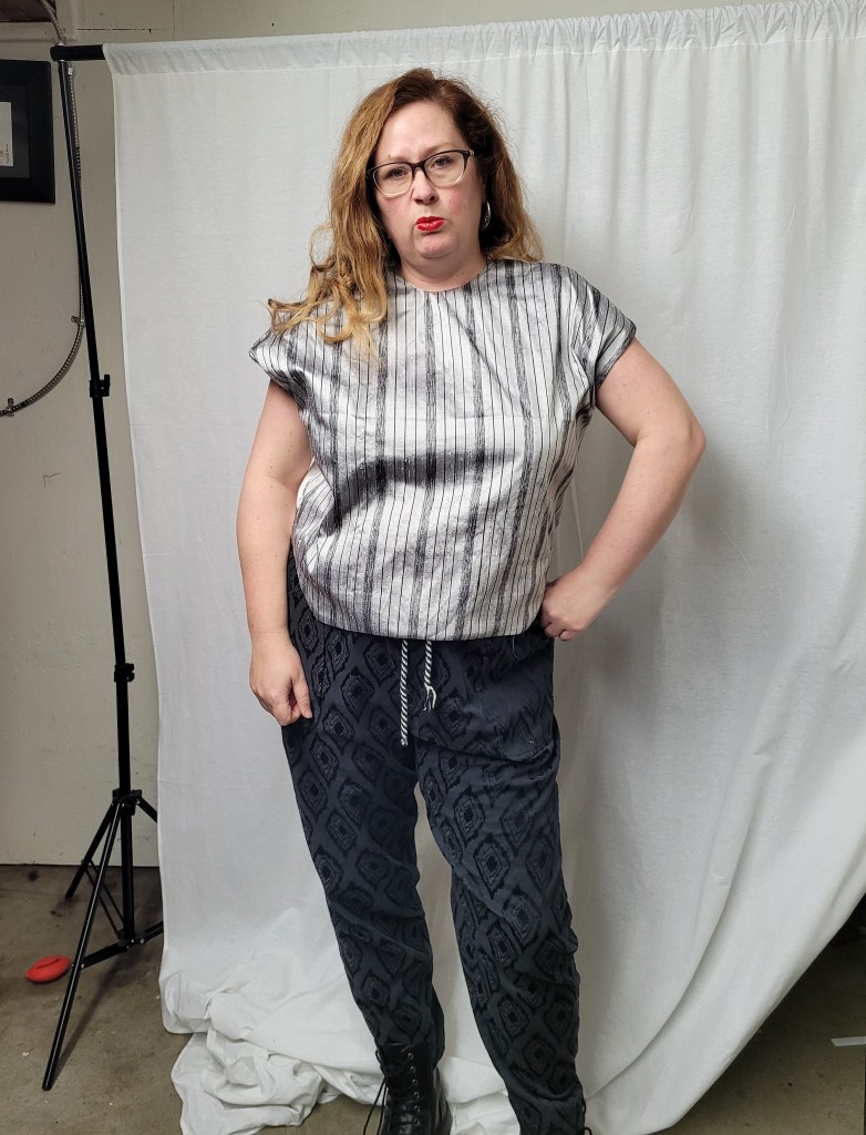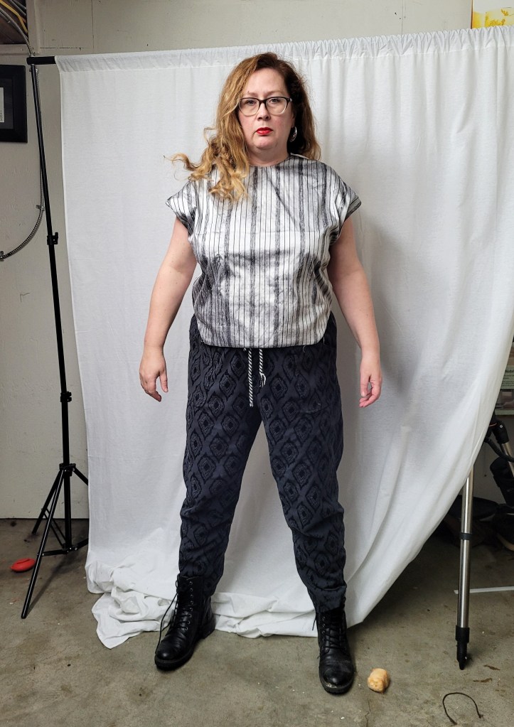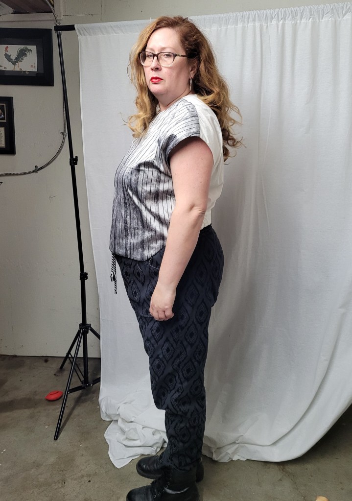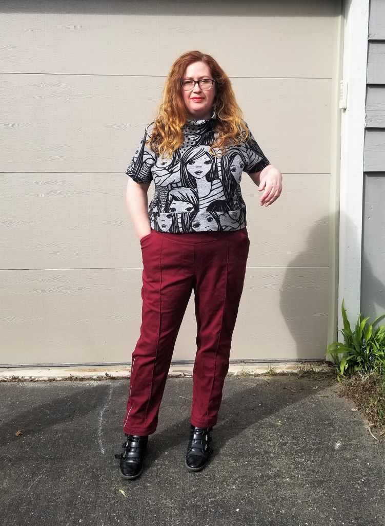 And lest you’re thinking, “But Claire, the designer is clearly wearing high-waisted pants and it does say it’s a cropped top”: I am wearing my high-waisted Dawn jeans, to which I lengthened the rise an additional inch or two. Any more high-waisted and they’d probably reach a regular-waisted person’s nipples. The problem is not the pattern – the problem is I didn’t make a muslin for my long-waisted/hipped body. Oh well.