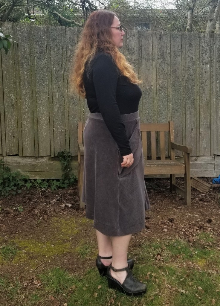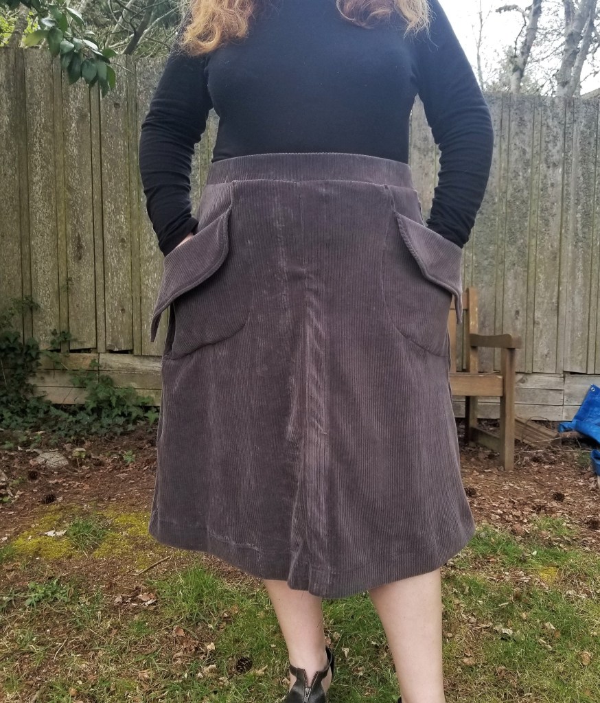 This pattern was intended for knit fabric as it’s a vintage Stretch n Sew pattern from 1975. However, this knit corduroy, while being as soft as a kitten’s whisper and of great quality, was very, vereeeeey stretchy and an absolute b&*^h to sew. It marked like a lump of Playdough and was thick as an elephant’s hide. Which led to a not-too-flattering fit around the waist. This was actually unsalvageable as a proper outdoor in-public garment. Boo. The bright side is that there has been no “public” this year, so I’ve actually been wearing it! Ha!