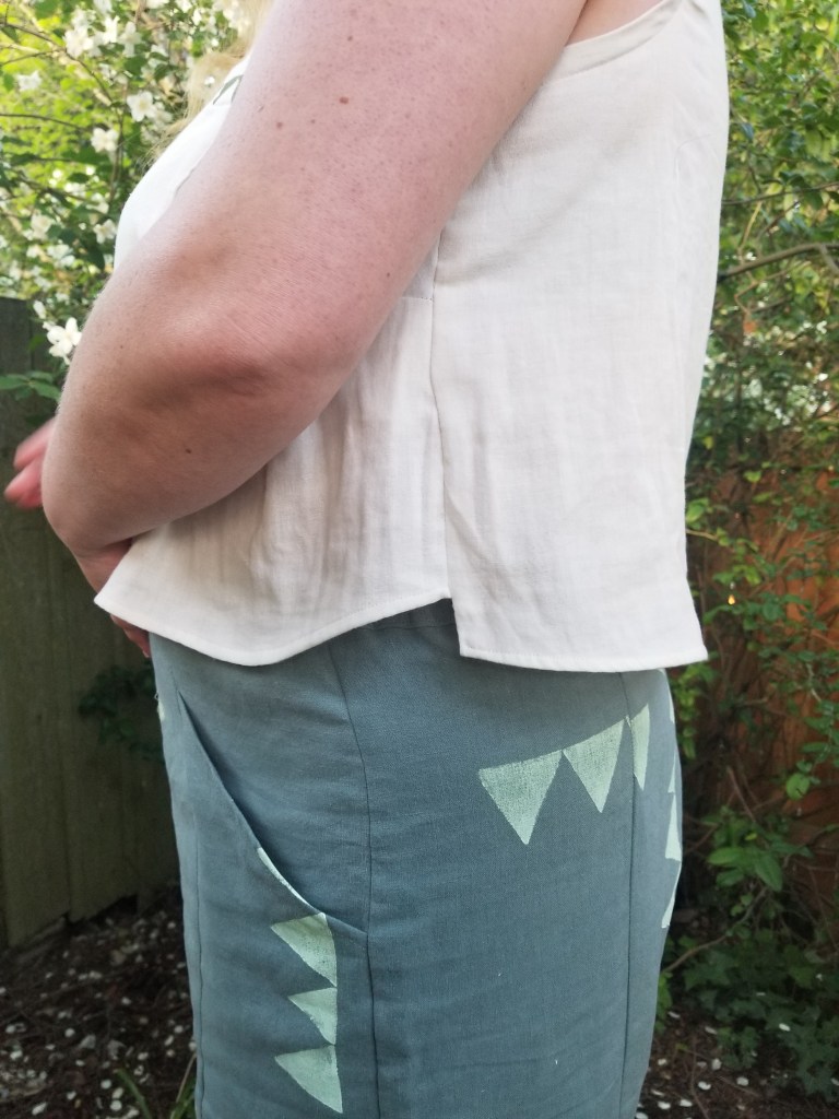 The problems with this project are multiple, but can mostly be summed up by saying that I started it several years ago as a seamstress of much less knowledge. It’s a simple and very well-designed top. When I look at it in front of me I just adore the dramatic curves of the hemline and the really nice finish you get.