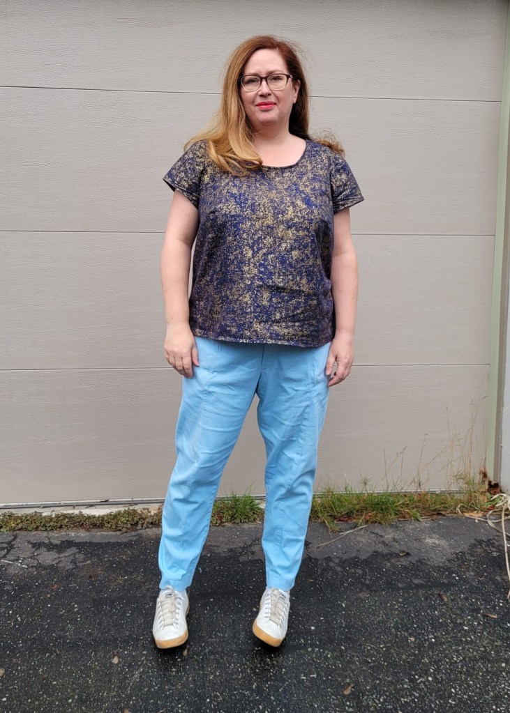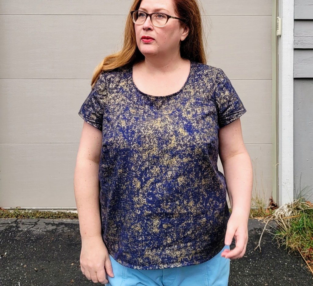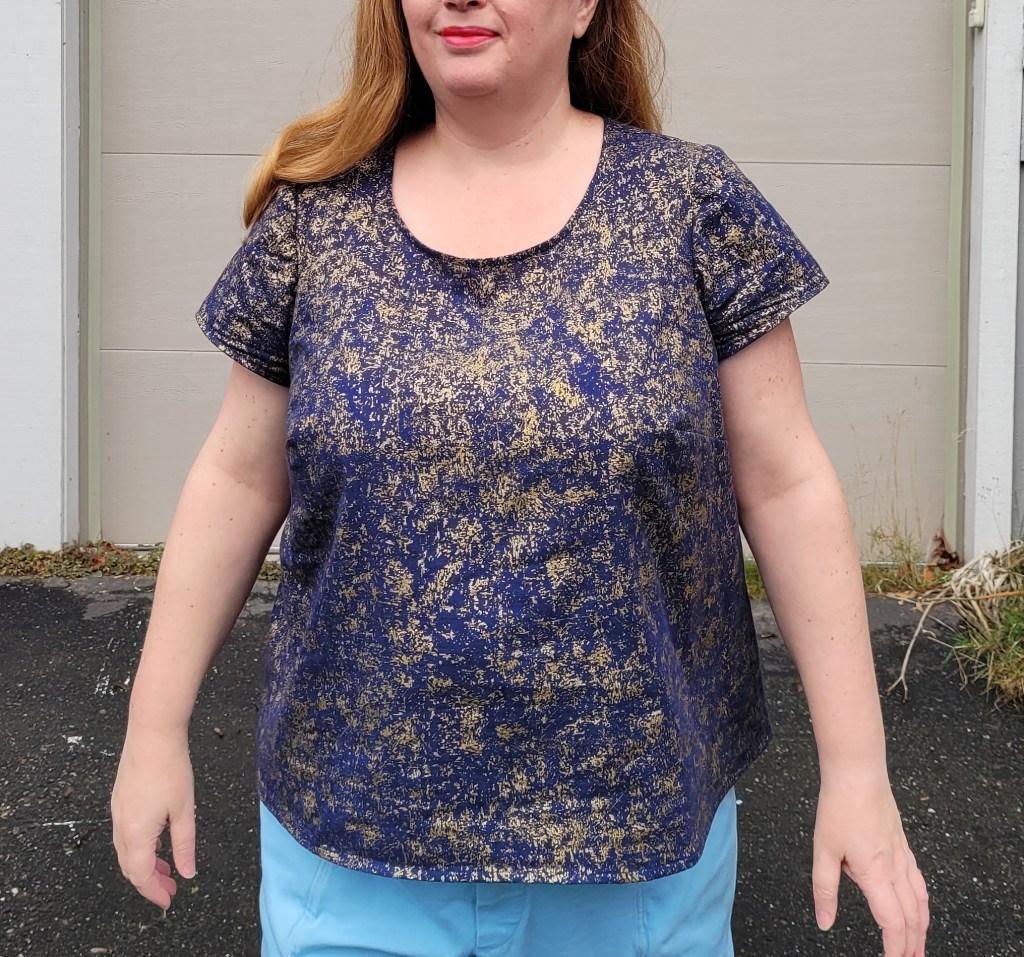 The second time I used a gorgeous Ellen Baker double gauze I had in my stash. I just love the navy blue and the metallic gold splatter effect. The dart is perfect in this top and it’s pretty, but I think the metallic component meant that it didn’t have as much softness as the average double gauze and so it behaves quite similarly to the quilting cotton in the end, haha!