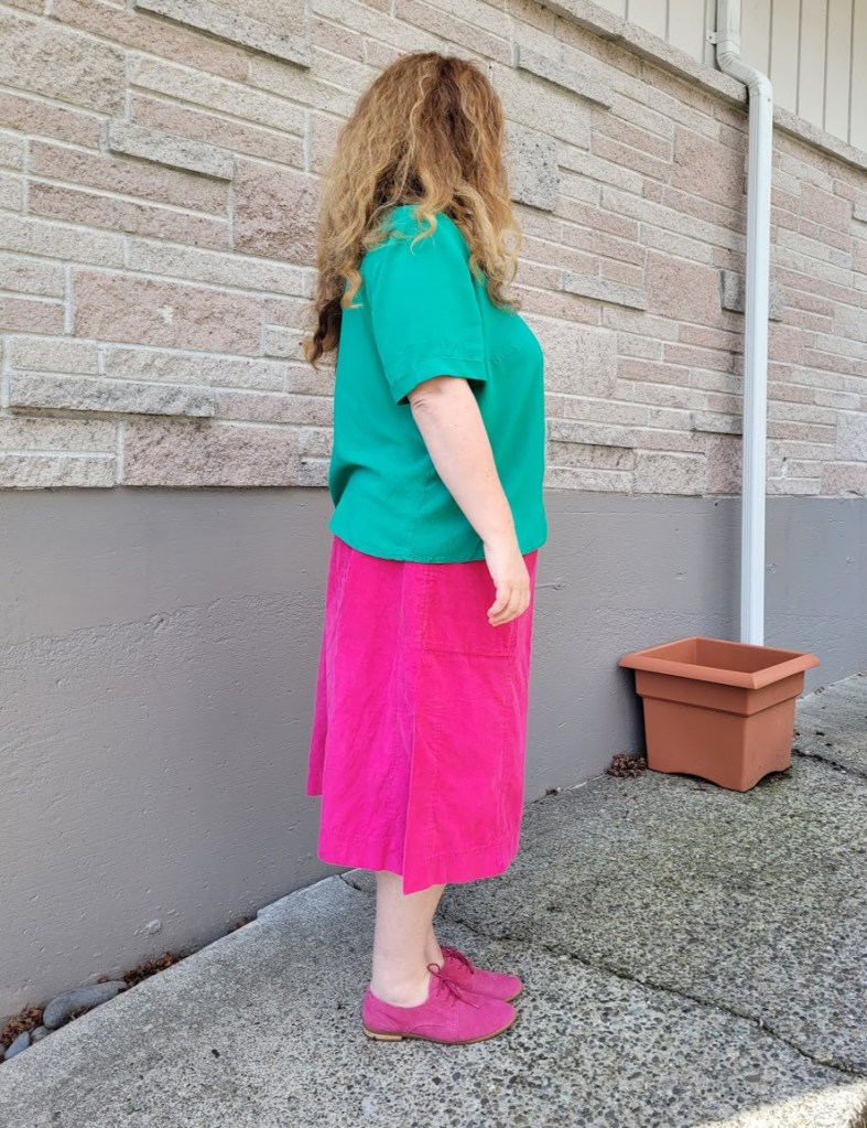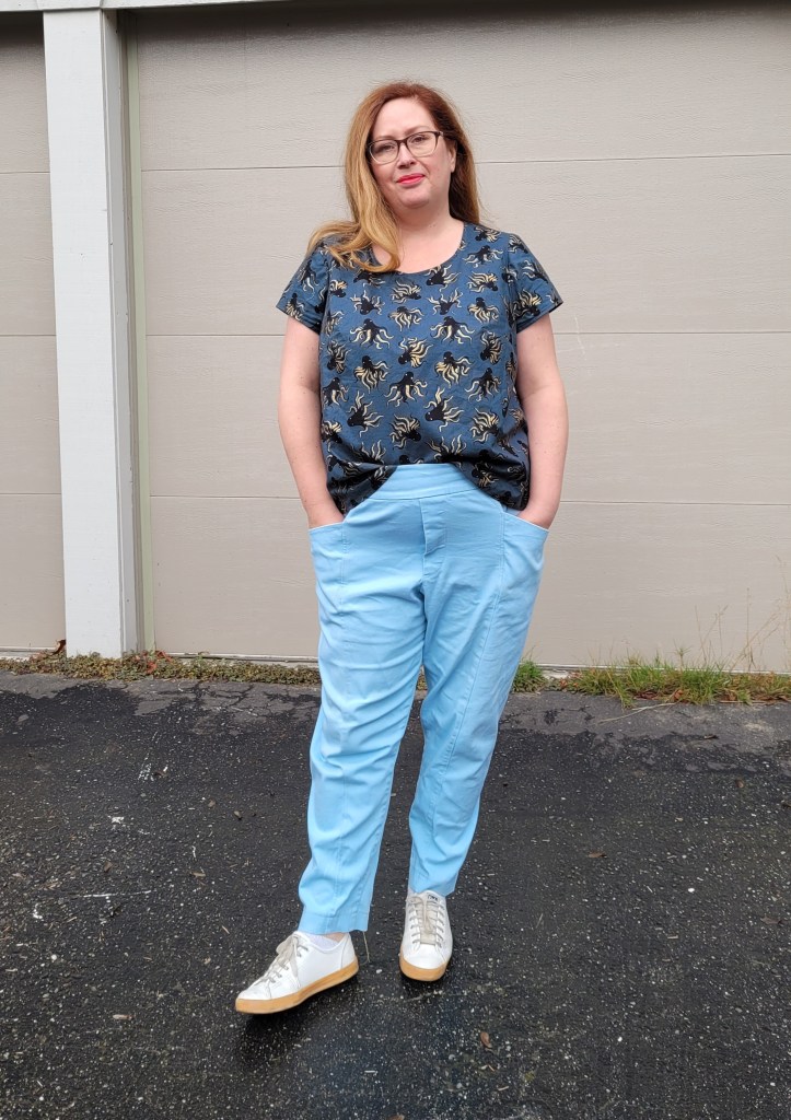 I think it has really nice proportions and I love the Scout in this much drapier fabric. It feels so nice to wear and, as you can see, the hand of the fabric helps avoid the total Spongebob Squarepants cuboid look. The only thing I will complain about is that this particular rayon gets very wrinkly around the seamlines in the wash and is a bear to iron. And I HATE ironing. Don’t mind pressing, but ironing… yuck. Ah well.