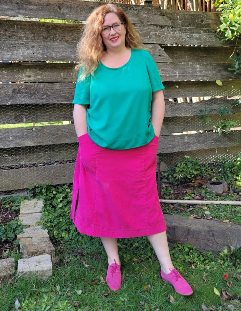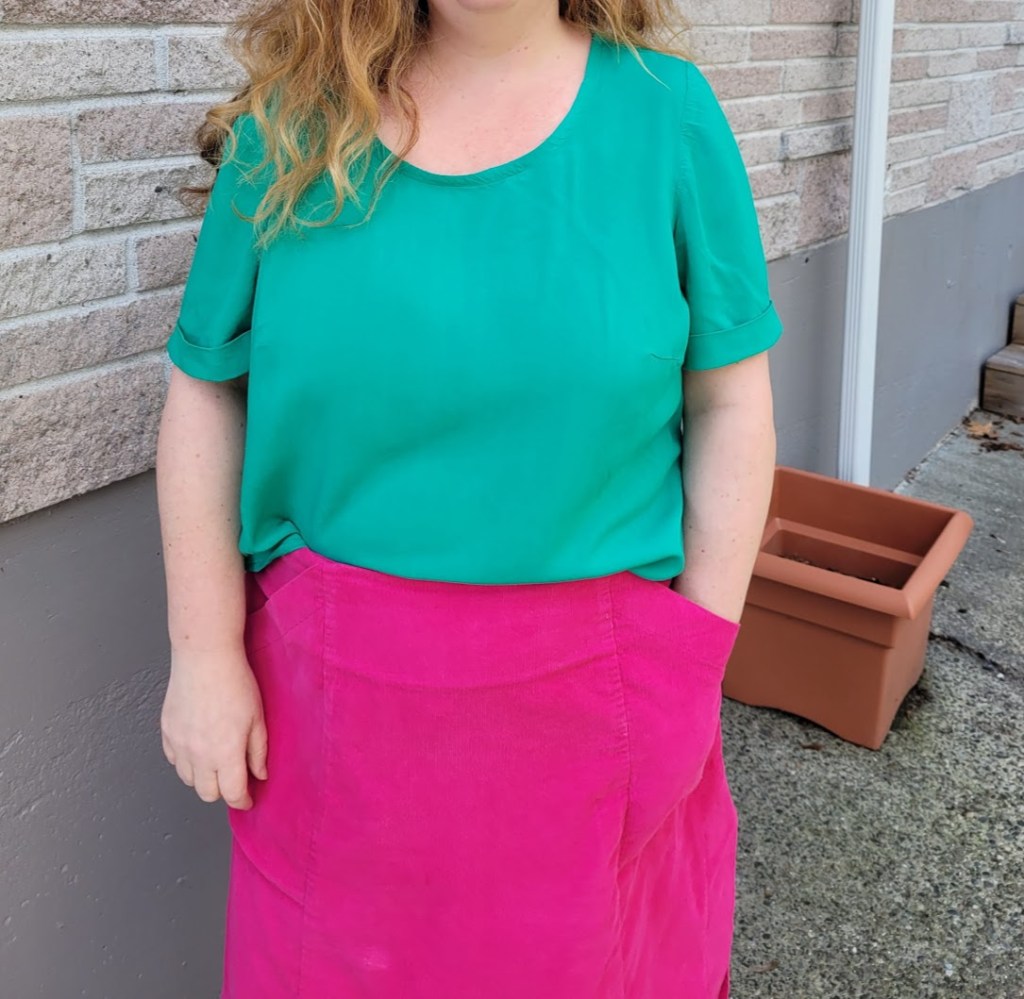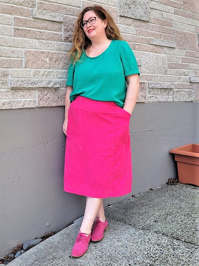 Wow, I just love all of your versions of the Scout! That last emerald one is your color, for sure! And so cute paired with the pink skirt (fuscia?) I am looking forward to trying the Scout and just got the new larger sized pattern delivered to my email. BUT, I wish it also included Cup sizes B and C. I seem inbetween a B and C, but my waist is HUGE due to being on prednisone longterm. I have big biceps. Thanks so much for your post! It really helps to “see” the pattern on someone. I think from seeing yours, that I am probably looking at doing an adjustment down to a C cup. Never done this adjustment before, so wish me luck! Congrats on your beautiful sewing!