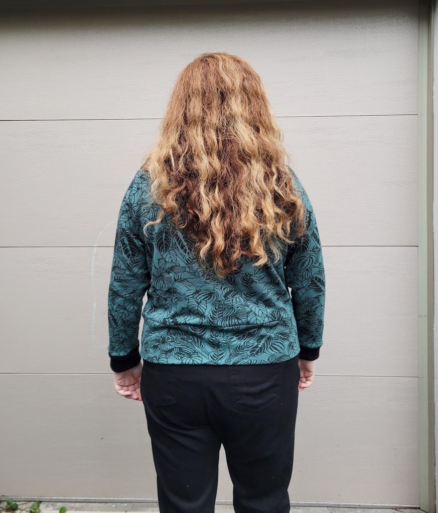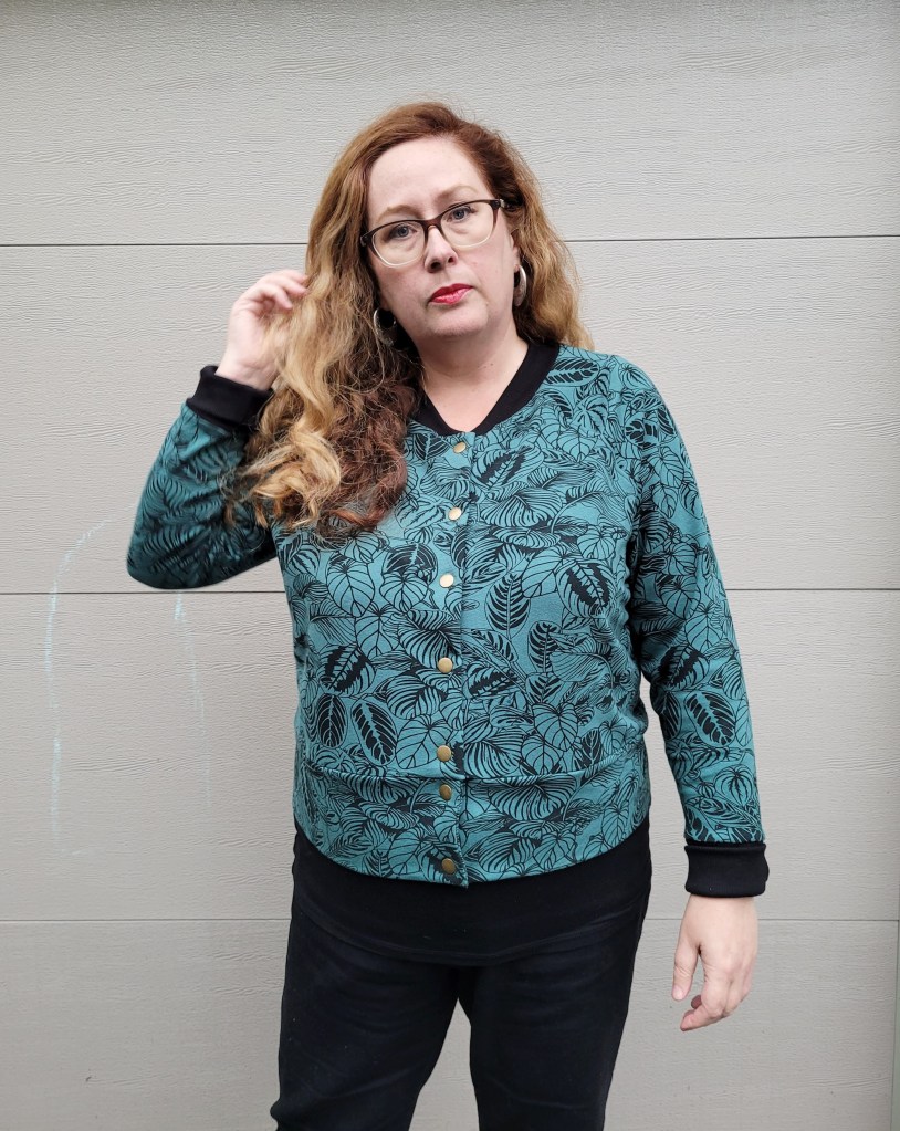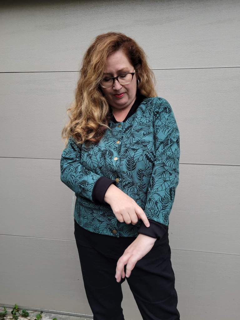 The Monarch Jacket has been around a little while, but is now available in extended sizing, which is based on a D cup bust and goes from size 12 to 30. It’s a boxy jacket that’s designed for thicker knit fabrics with a raglan sleeve and a bomber-type little collar. As you can see in the line drawing, the new version has bust darts, more snaps/buttons and also a divided waistband. I knew as soon as I saw the pattern that I wanted to use one of several gorgeous pieces of See You at Six fabric I bought last year and this green foliage print was my chosen piece.