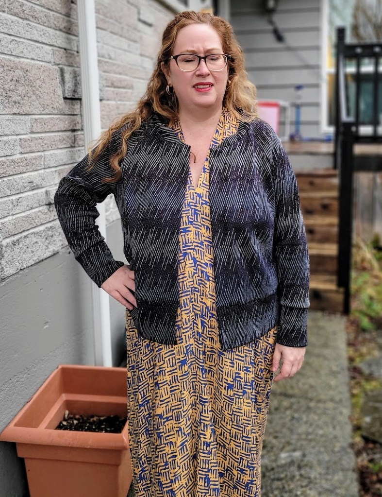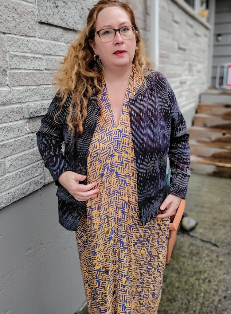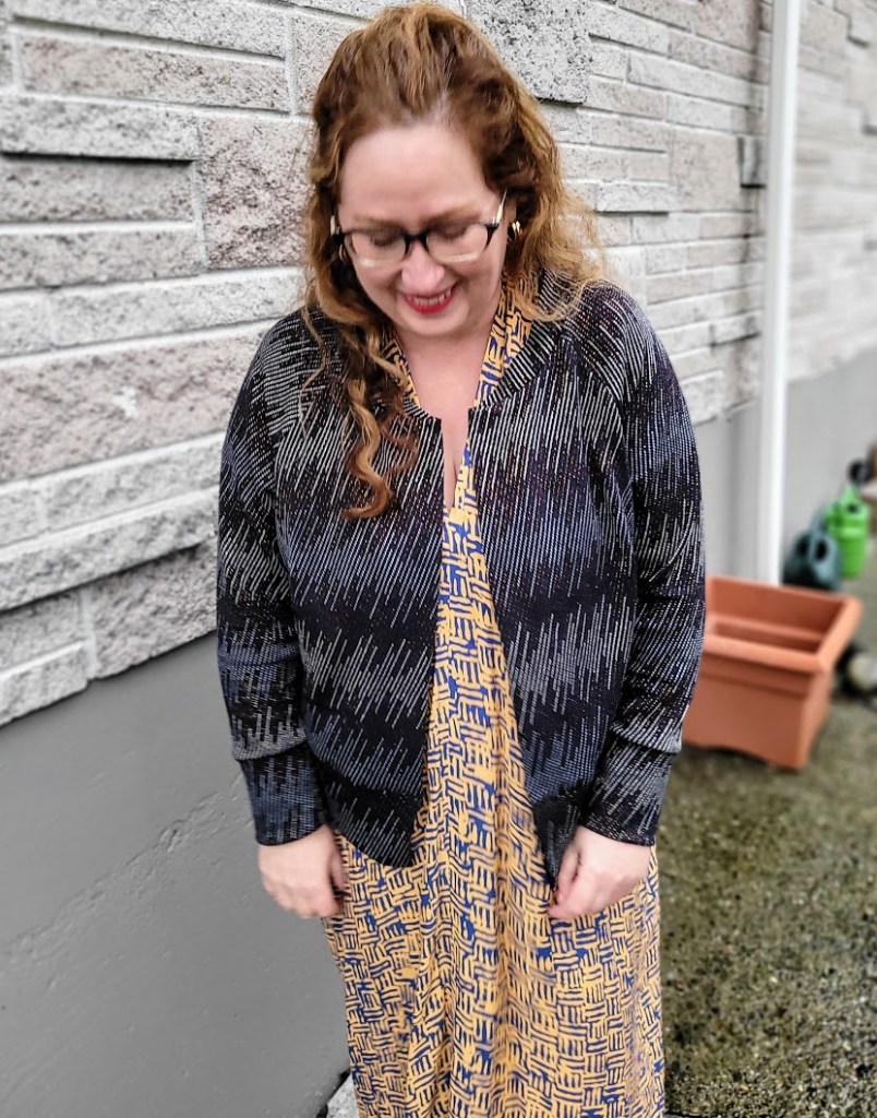 As mentioned, some of the testing feedback led to the final pattern having a dart added and a few other small tweaks. I had planned to make a second version anyway, so this was a great opportunity to do so. I decided to change it up a bit and go for a bit of a different feel this time. I went up to a size 18 because this time I wanted to create less of a sporty layer and more of an actual boxy jacket – a real outerwear piece, I suppose. My idea was to create something I could wear out over a dress in warmer weather, like this Cris Woods Envelope Dress, since I mostly seem to have heavier outerwear.