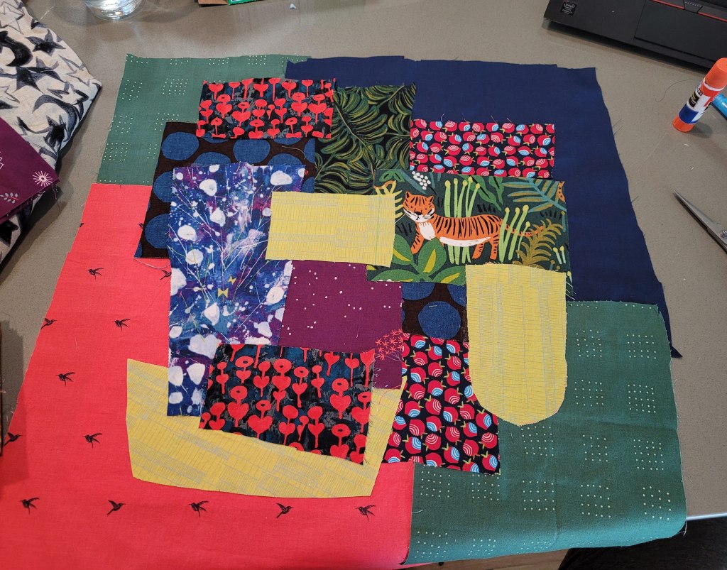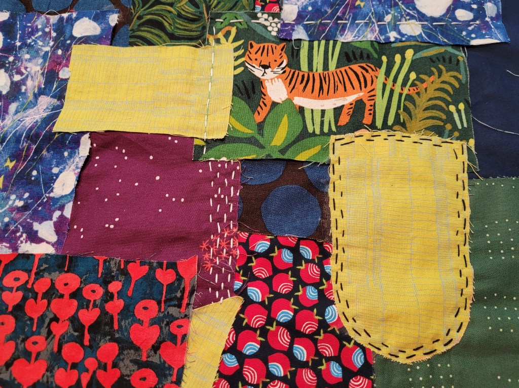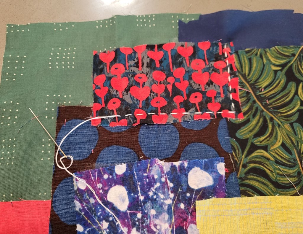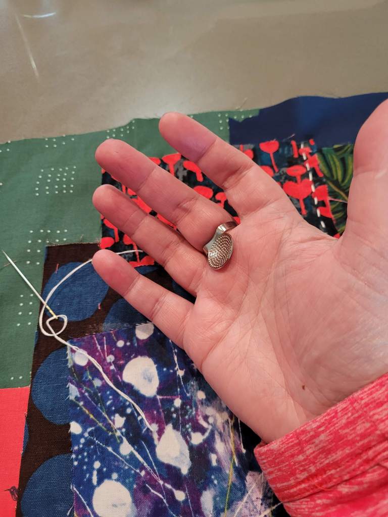 Next, it was time to start stitching. For this kind of stitching you use a very long needle and a palm thimble, which I’d never seen in my life before and would never have figured out how to use it. The point is that by the time you build up your scraps, you’re stitching through quite a few layers. It’s quite physical work and you use the palm thimble to push your needle through the dense layers as well as protect your hands.