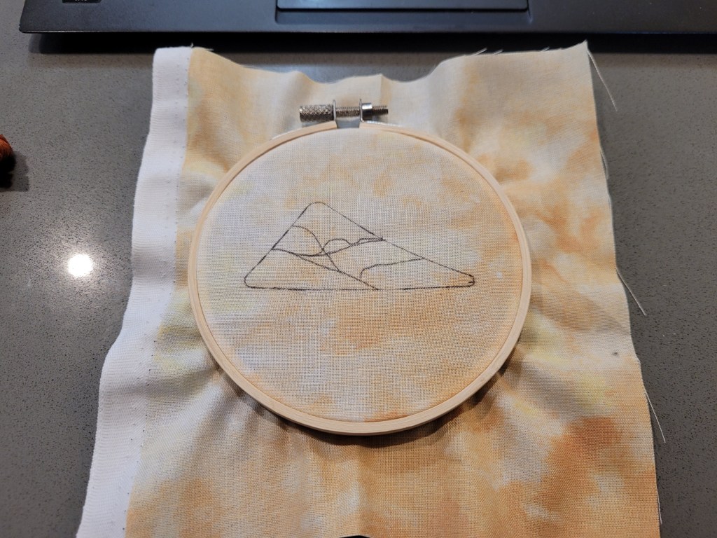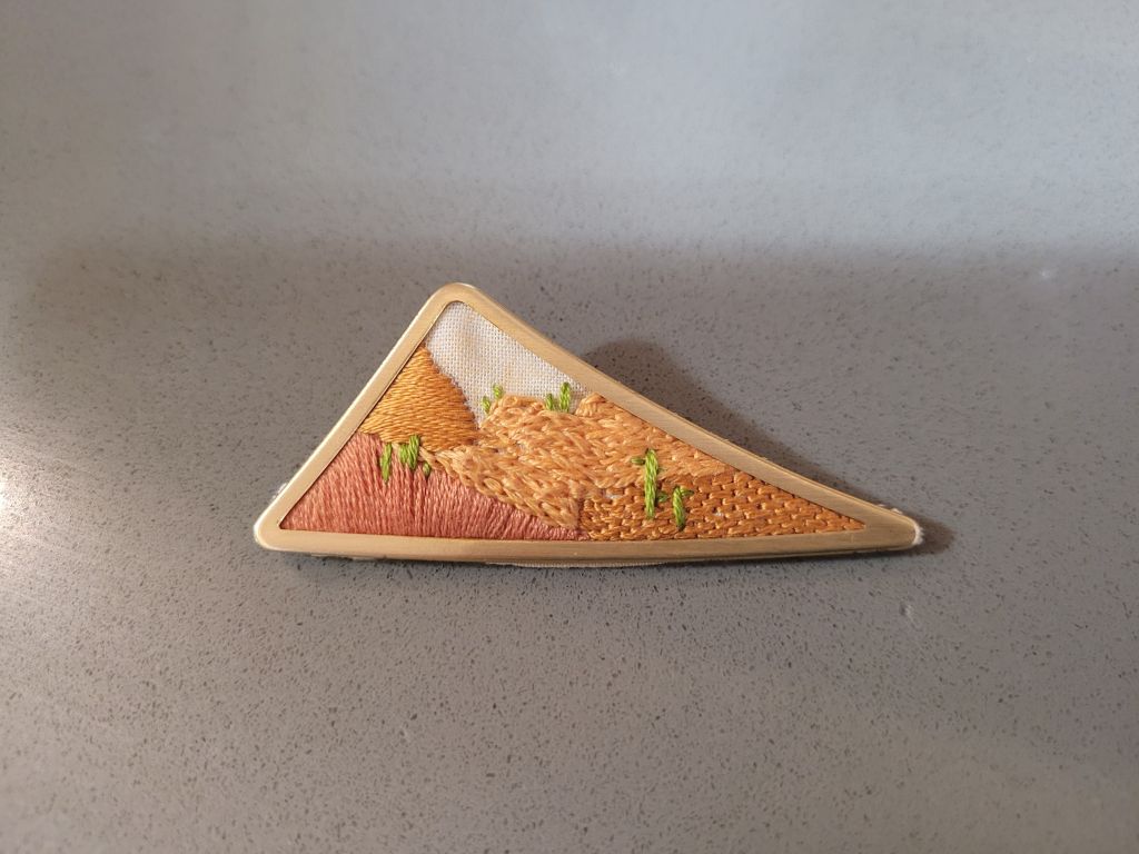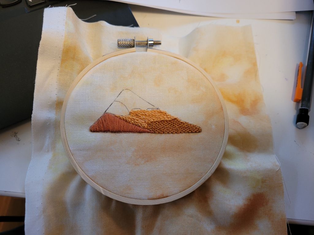 This class was taught by Melissa who is the fibre artist behind MCreativeJ, local to me here in Seattle. She was super laid back and gave us plenty of time to work on each part, so it was a really nice, relaxed vibe. We were provided with a lovely little kit and first attached the canvas to the mini-hoop she sent us. We traced round whichever shape of brooch we’d received and freehanded a couple of slopes for the desert landscape.