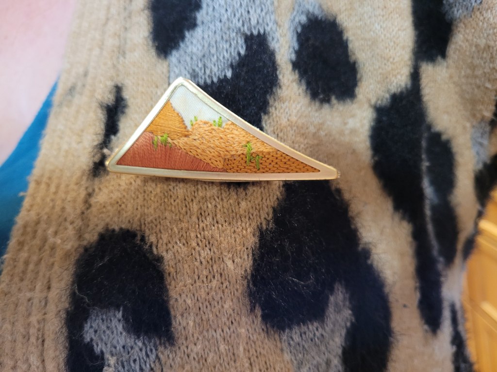 My next class was another type of hand stitching, but this time it was embroidery. Not something I’ve done much of, but I was attracted by the cute landscape pin and also by the fact this project seemed doable in the time. It’s nice to finish something off in class sometimes.