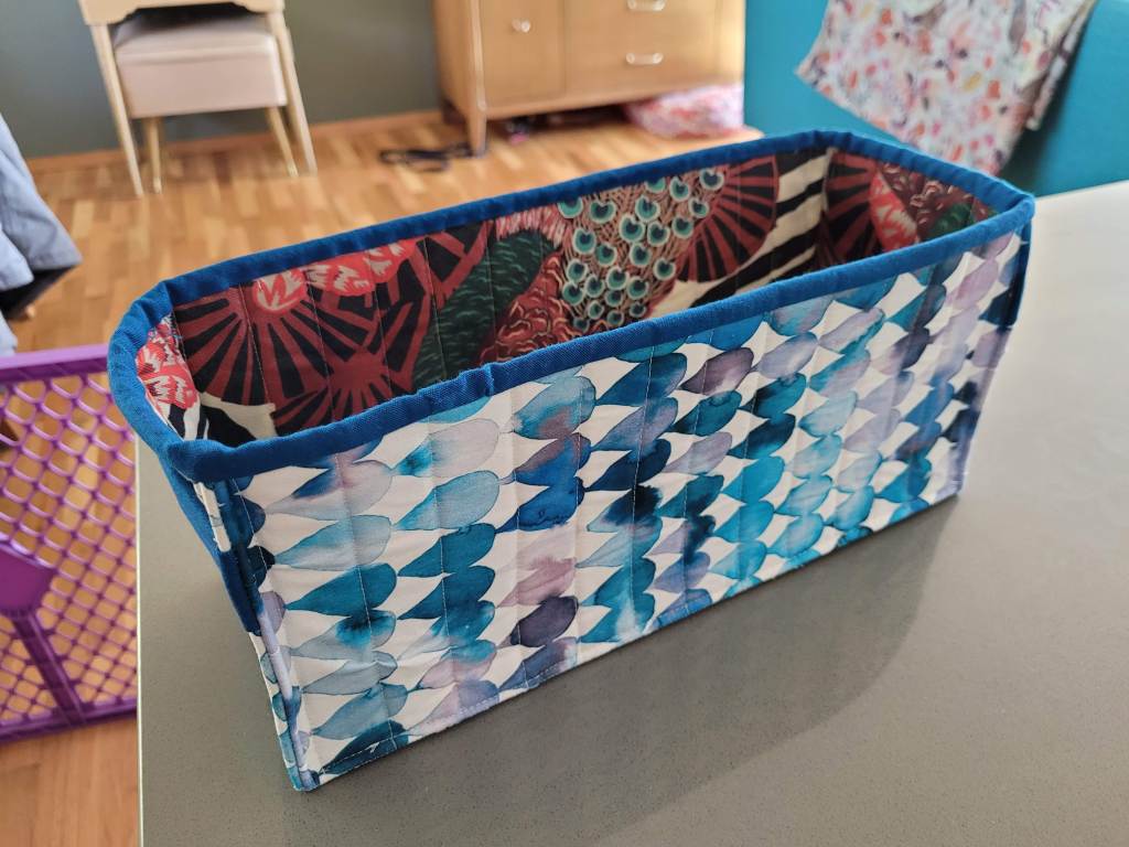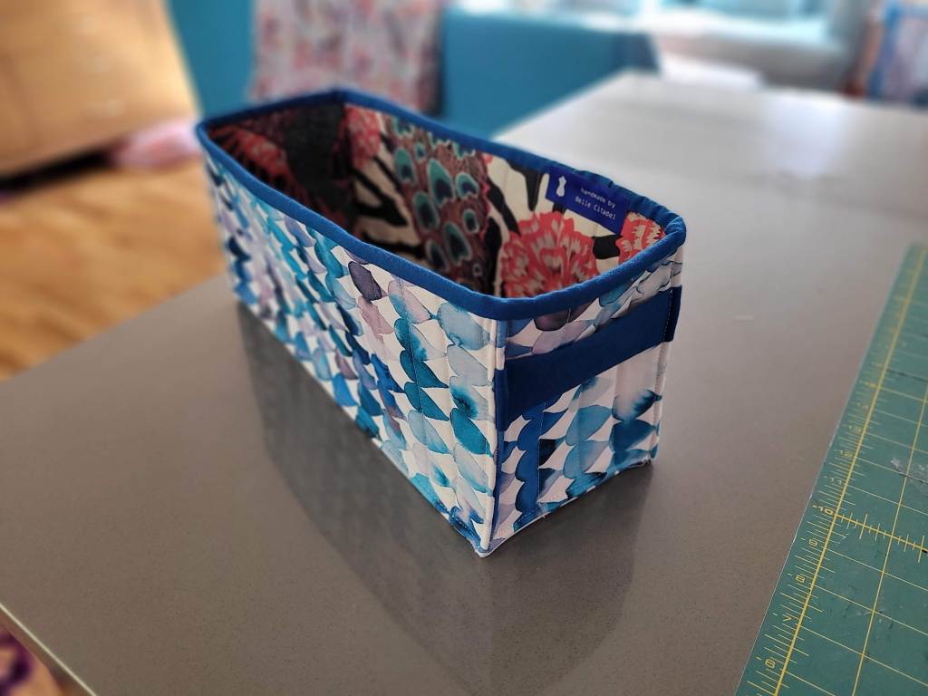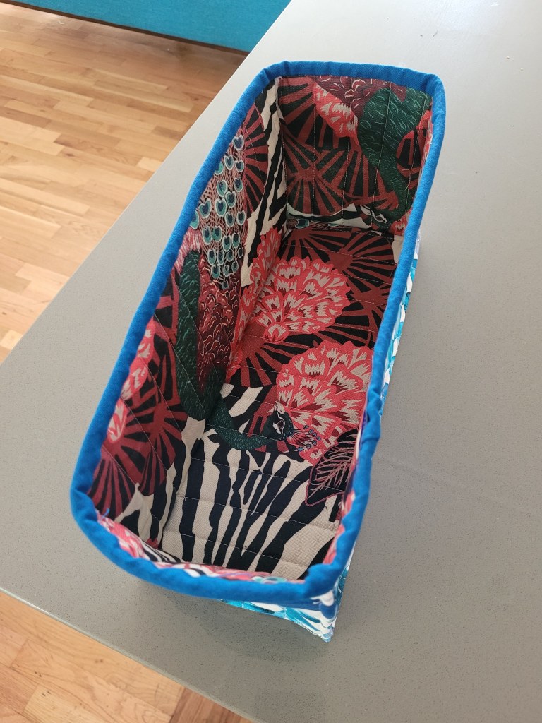 There were some nifty tips and some precise stitching to create rigidity, such as the 1/8-inch topstitching around the seams you can see. We added handles and finished the top with self-made binding, although there’s an option in the pattern to bind all the seams too. Lois from Clearview Design kept us moving at a good pace, so this was also a project I finished the same day. Now I just need to make four or five more! Lol.