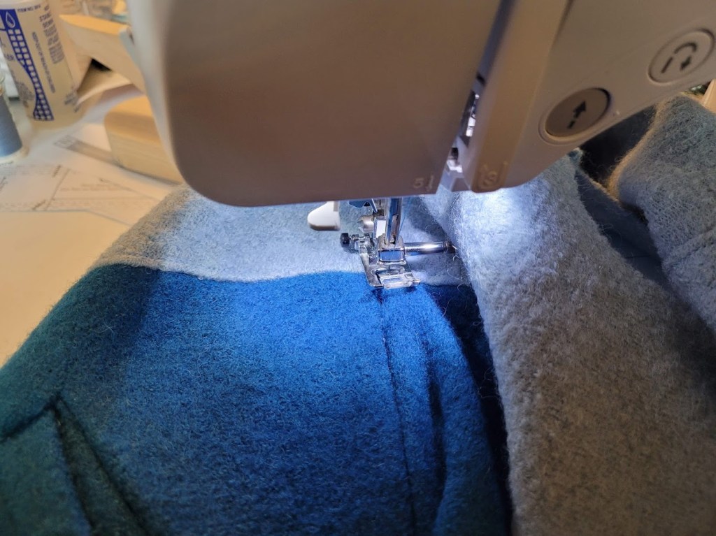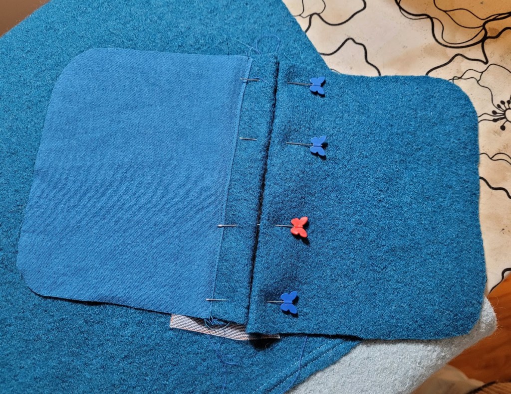 To create the welt pockets, I wasted a bit of time trying different approaches from patterns I’d used already, before ultimately scrapping that idea as more trouble than it was worth and looking for something I could do from scratch. I hunted around the internet a bit and came across this YouTube video from designer Diane Deziel, which I thought was very clear and also provided some free pattern pieces. Problem solved and I used her method, which resulted in some pretty nice pockets. The stretchiness of the boiled wool did make it a little tricky to get quite the angles I needed, but with a bit of patience I got there. It looks like she has lots of other useful videos too, so I will need to take a closer look soon.