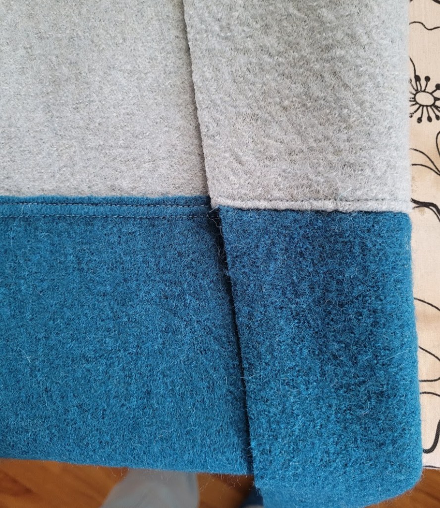 Finally, and I guess this isn’t exactly a design change per se, but I decided to make a two-tone jacket, as you can see. I really wanted it to reflect the water and the sky of Scotland, and also wanted to create an outfit in lots of different blue tones, so I decided to use a baby blue and petrol boiled wool, both of which I bought from Lillestoff last year (walkloden), although they don’t appear to be carrying it now.