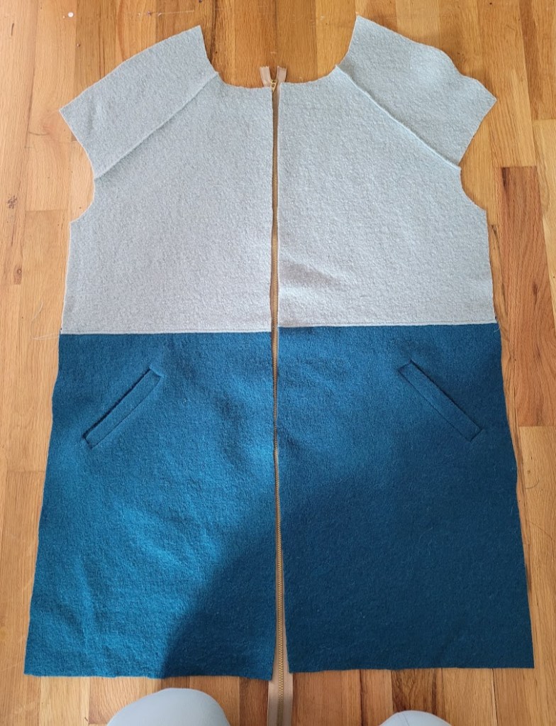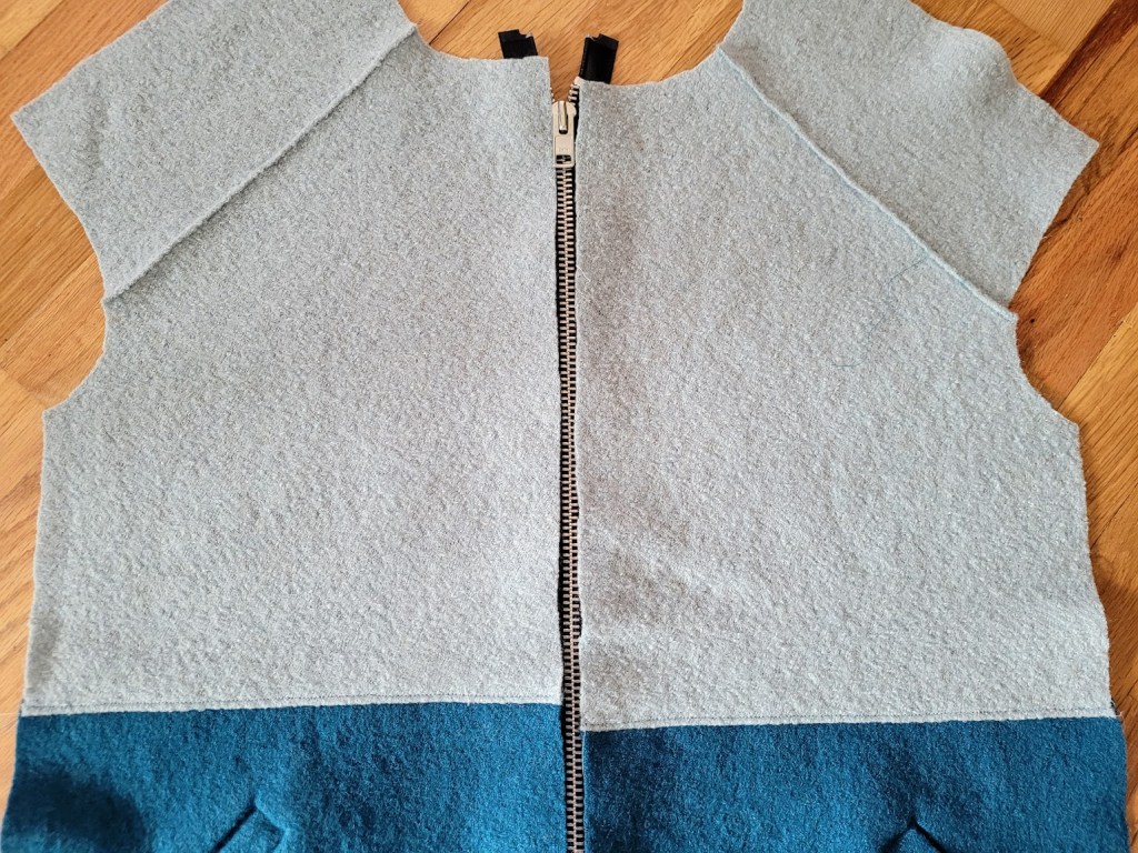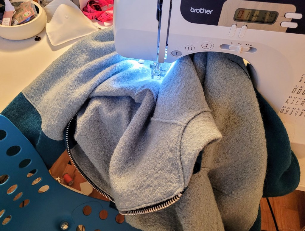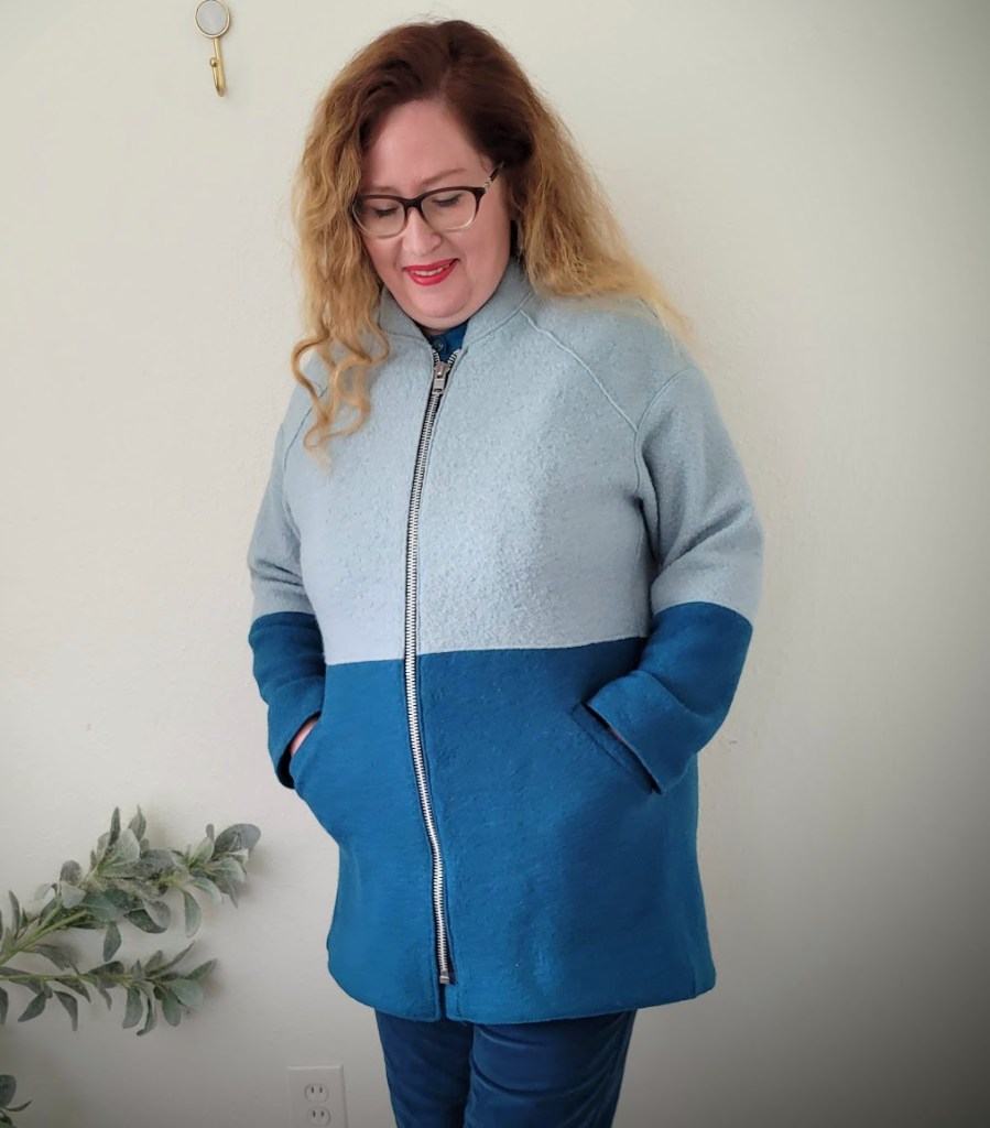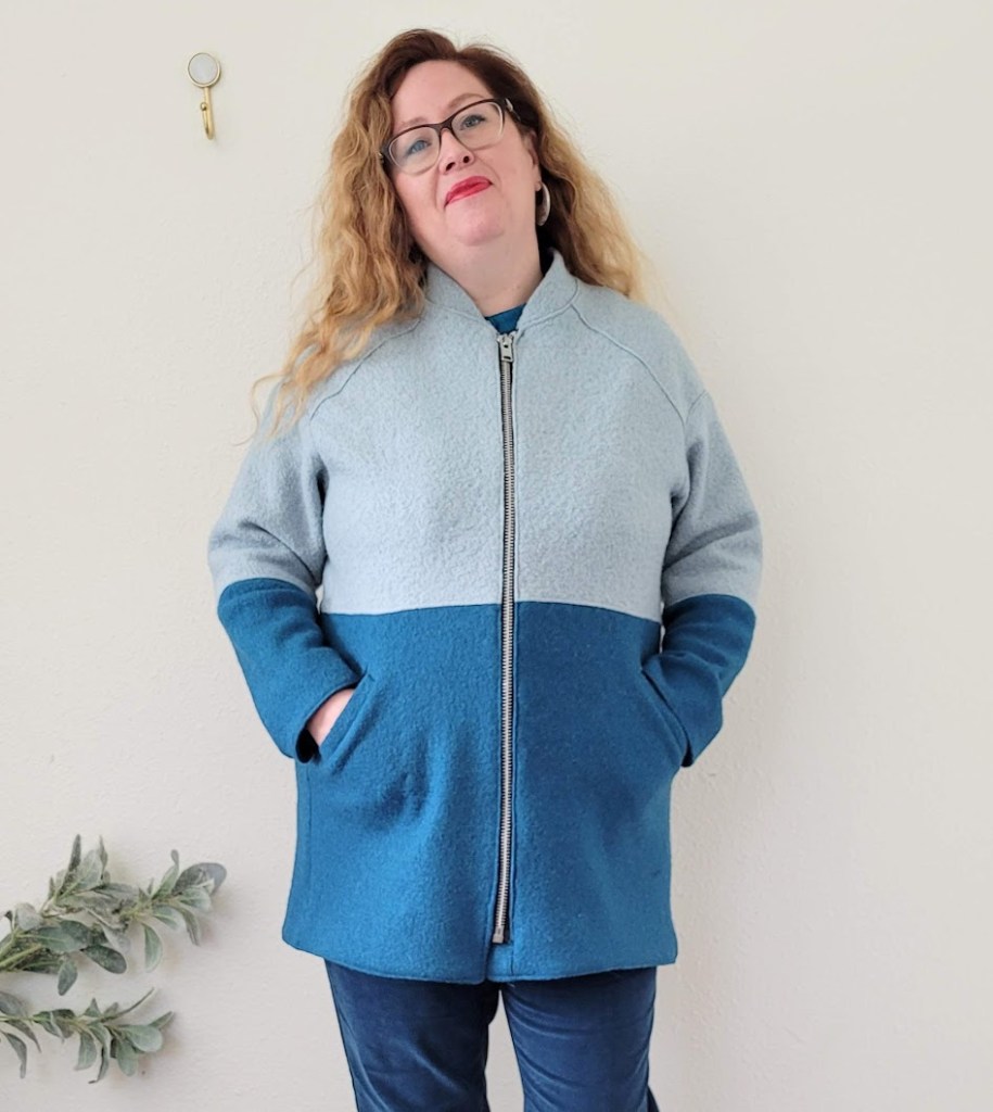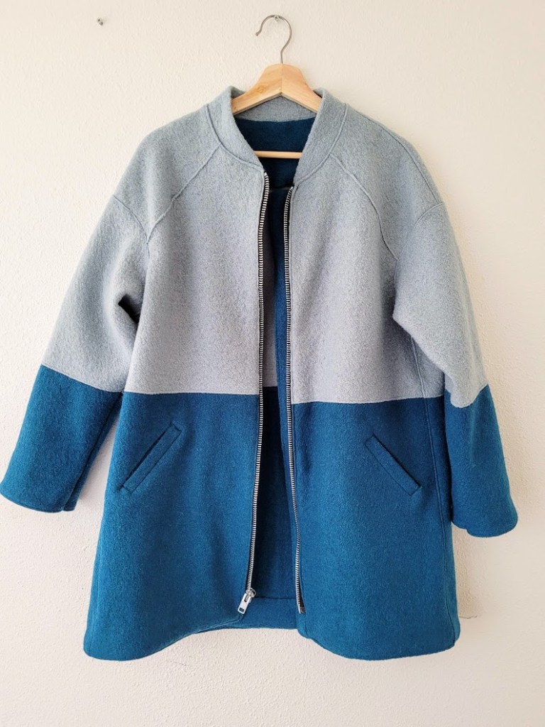 The Casey is designed for wool, including felted and boiled varieties, so it was a good starting point from the get-go. It also had the slight cocoon shape I was after, albeit a bit of a different cocoon, as well as a full length open-ended zipper and the sports collar. Where it differed was in the sleeve type – dropped rather than raglan – and it had a two-piece body and sleeve. Other really nice details included in the Casey design are a full-length zipper fly, which I’ve never sewn on a coat, in-seam pockets and facings for the coat front, sleeves and hem.