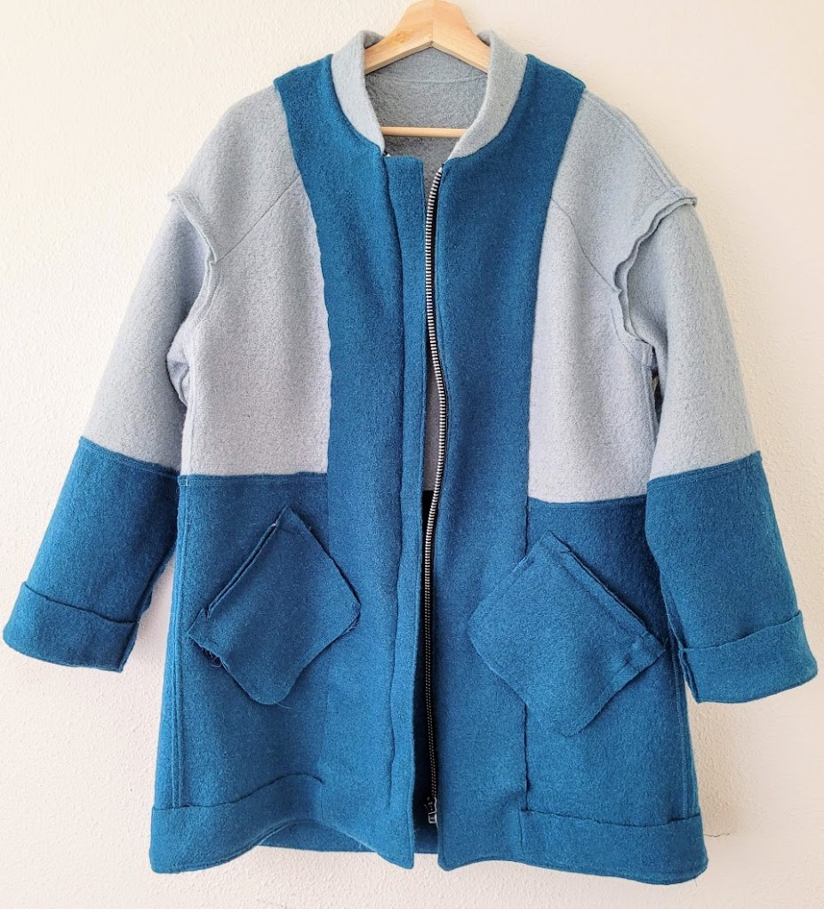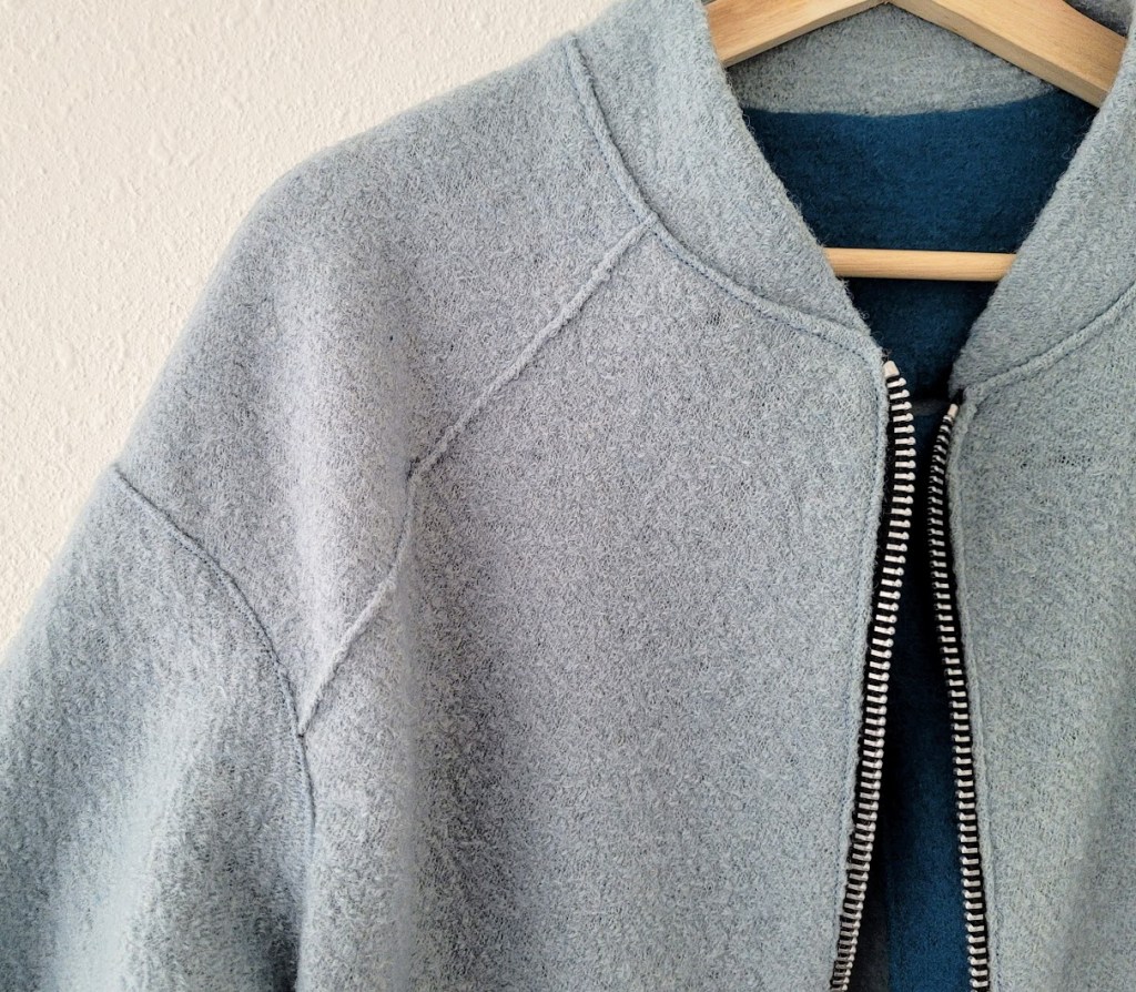 Boiled wool is a good choice for a quick (relatively speaking) jacket or coat. It doesn’t need to be finished and, in fact, you can leave it completely raw-edged if you like, although that wasn’t the look I was going for. But it does mean that you don’t necessarily need a full lining, or even facings, although this pattern did include those.
