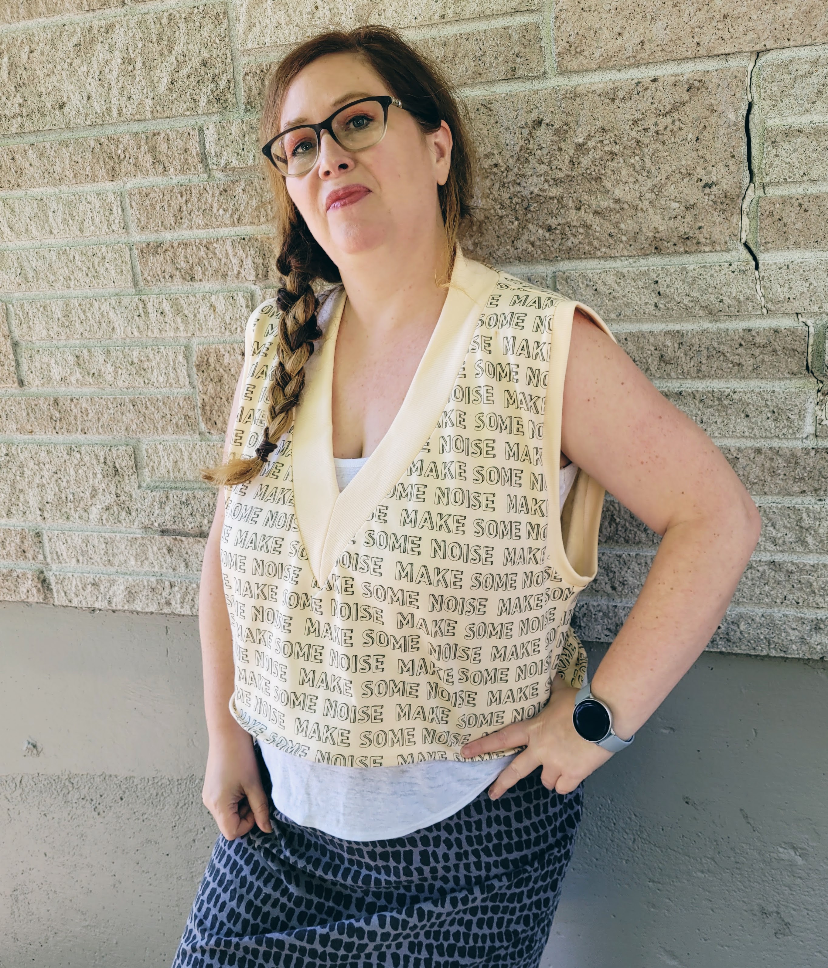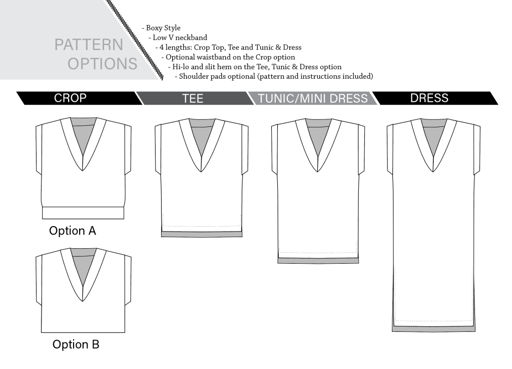 Other details include a slit hem, hi-lo hem options and an optional waistband on the cropped version (I didn’t use it). The armholes are finished with simple deep armbands and, overall, as you would imagine, this is a pretty quick sew. I used the serger for most of it, but the V neck is made using the machine.
