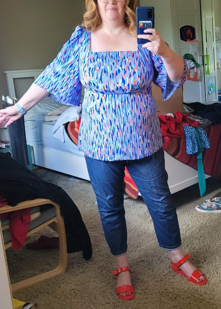 PLEASE try and look past the detritus of my spare room, hah. If you do, you’ll see that the muslin was actually a rather nice fit! In fact, if I’d had enough of this cheapy challis, I would have just made the dress in this! As it is, I’m still planning to hem it and use it as a top. The sleeves were… interesting. From this test, I decided to shorten the final sleeves by an inch to make them around “elbow-length” as described. Once I’d made the final version, however, they seemed a little short and actually creep up a bit! I’m not sure how that’s entirely possible, the way they look here, but it’s something to be aware of I suppose – that the final elastic may make more difference than you anticipate.
