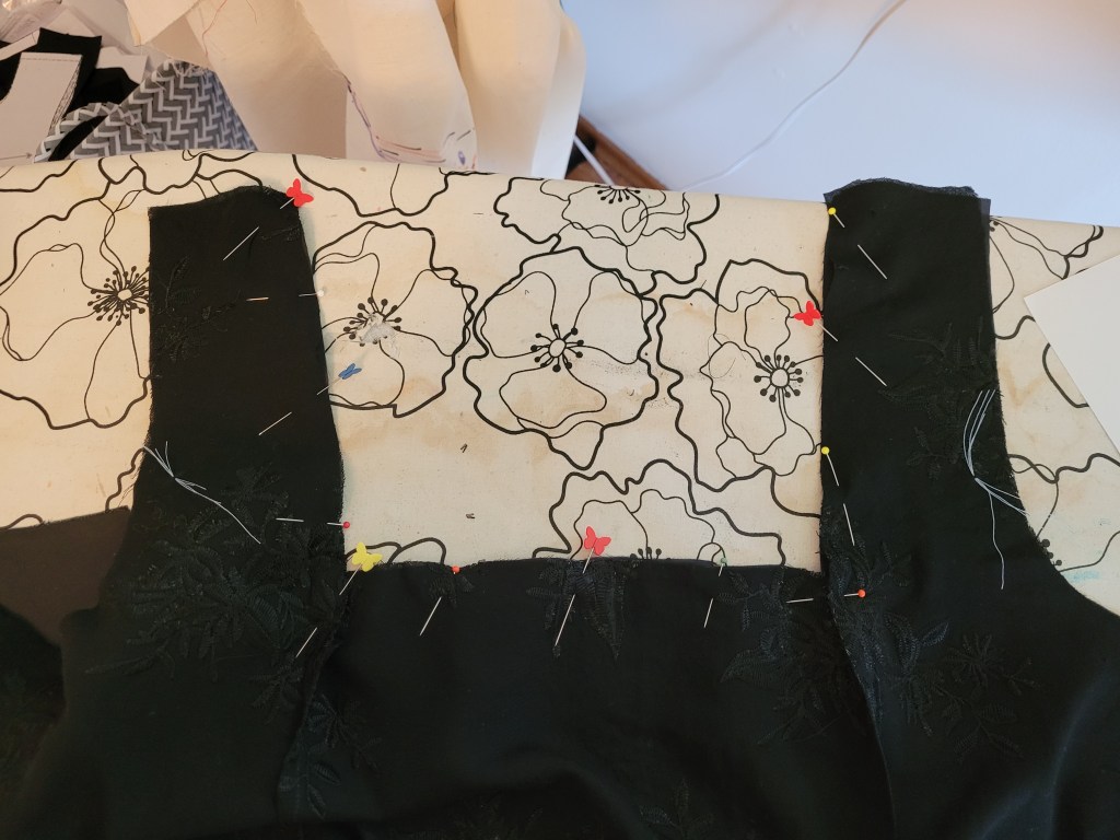 Since I made this, I’ve noticed a few other puffy black summer dresses pop up on my feed, so can it be possible that I’m on trend? Stranger things have happened. The embroidery on the crepe is really beautiful and quite thick. Being crepe, it’s not totally opaque (although not bad) and so I decided to make the version of Pauline with the lining. This made me slightly nervous as I haven’t made a ton of lined garments and I haven’t always had the best experience with linings, but this one is explained very well in the instructions and it went without a hitch. I used a lovely swishy Bemberg cupro lining, which is my favourite.