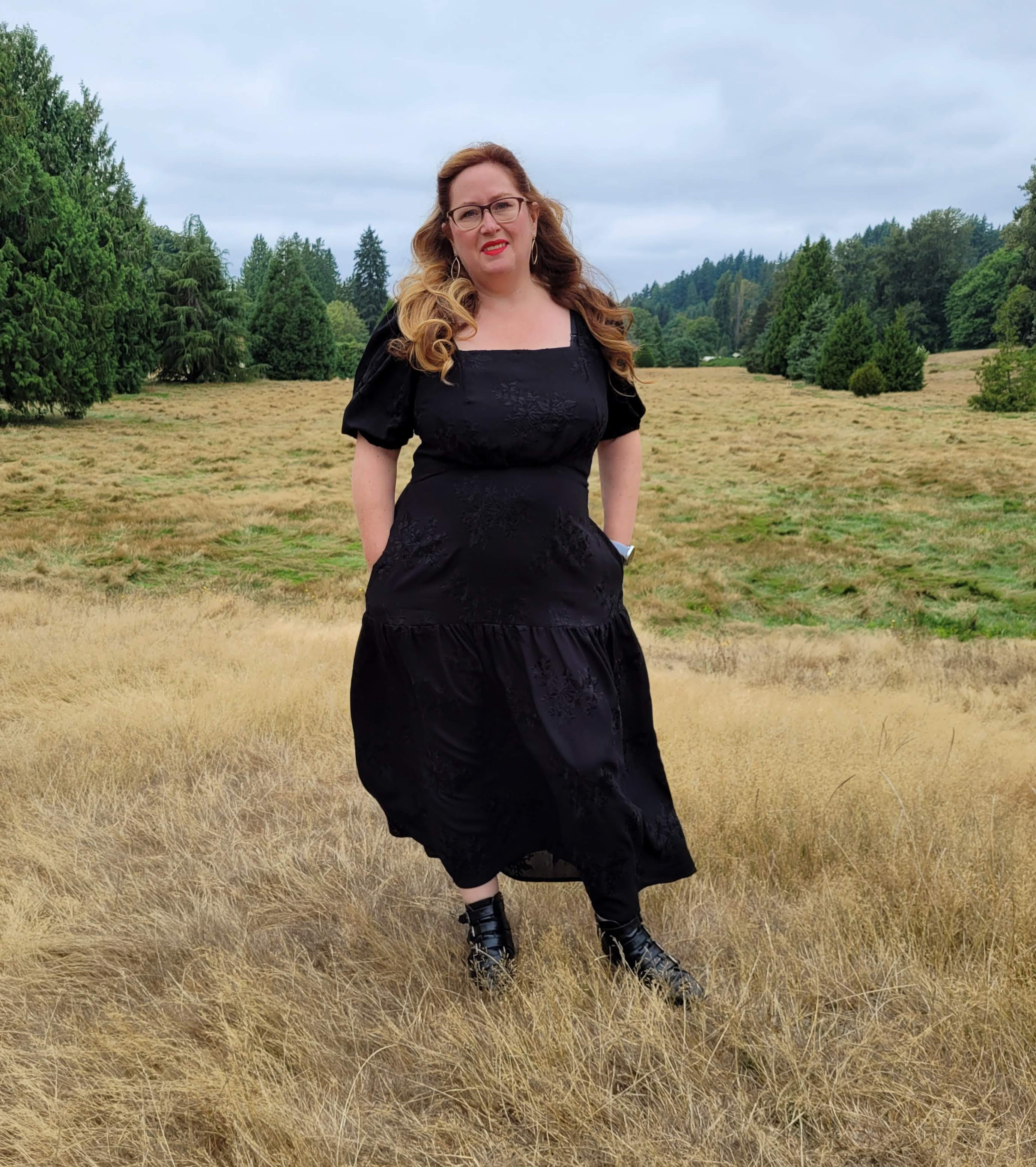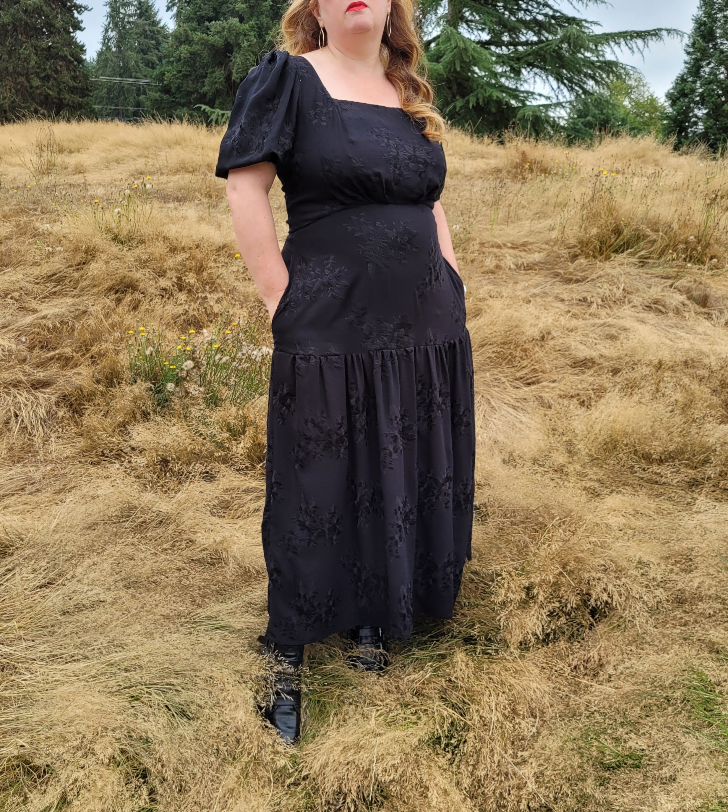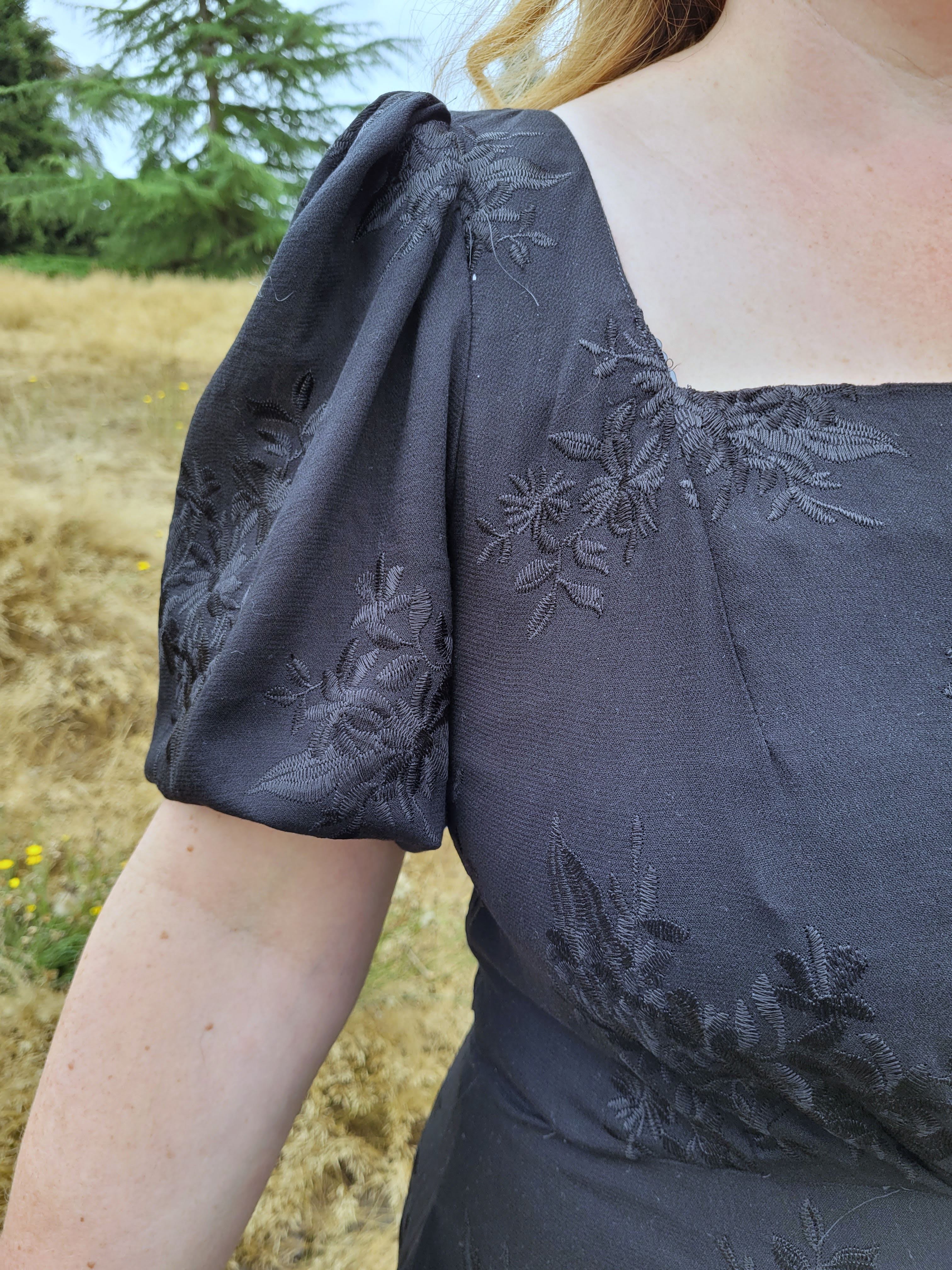 Nevertheless, there’s no denying this is a romantic statement of a design and I went through my fabric collection several times, choosing things, putting them back, trying other things and just could not decide on something. Everything seemed either too girly, or the wrong drape or colour. Then I happened to see some new fabric from one of my favourite small deadstock stores: L’Etoffe Fabrics, based out of San Diego. Ina has such a great eye and always has something interesting arriving in her online shop. This black embroidered crepe was beautiful, there was only one piece of it, and I immediately thought, “Oooohhh, a BLACK summer dress?” Why not? Add a little edge to the romance? In my head I had some sort of Spanish-influenced thing going on, but I think the final reality has more of a Wuthering Heights vibe happening. To top it off, my local park where we walk the doggy even has a vaguely moors-like feel to it at the moment, so it’s perfect! (Heathcliff took the photos and he fulfilled the grumpy partner role wonderfully. Lol.)