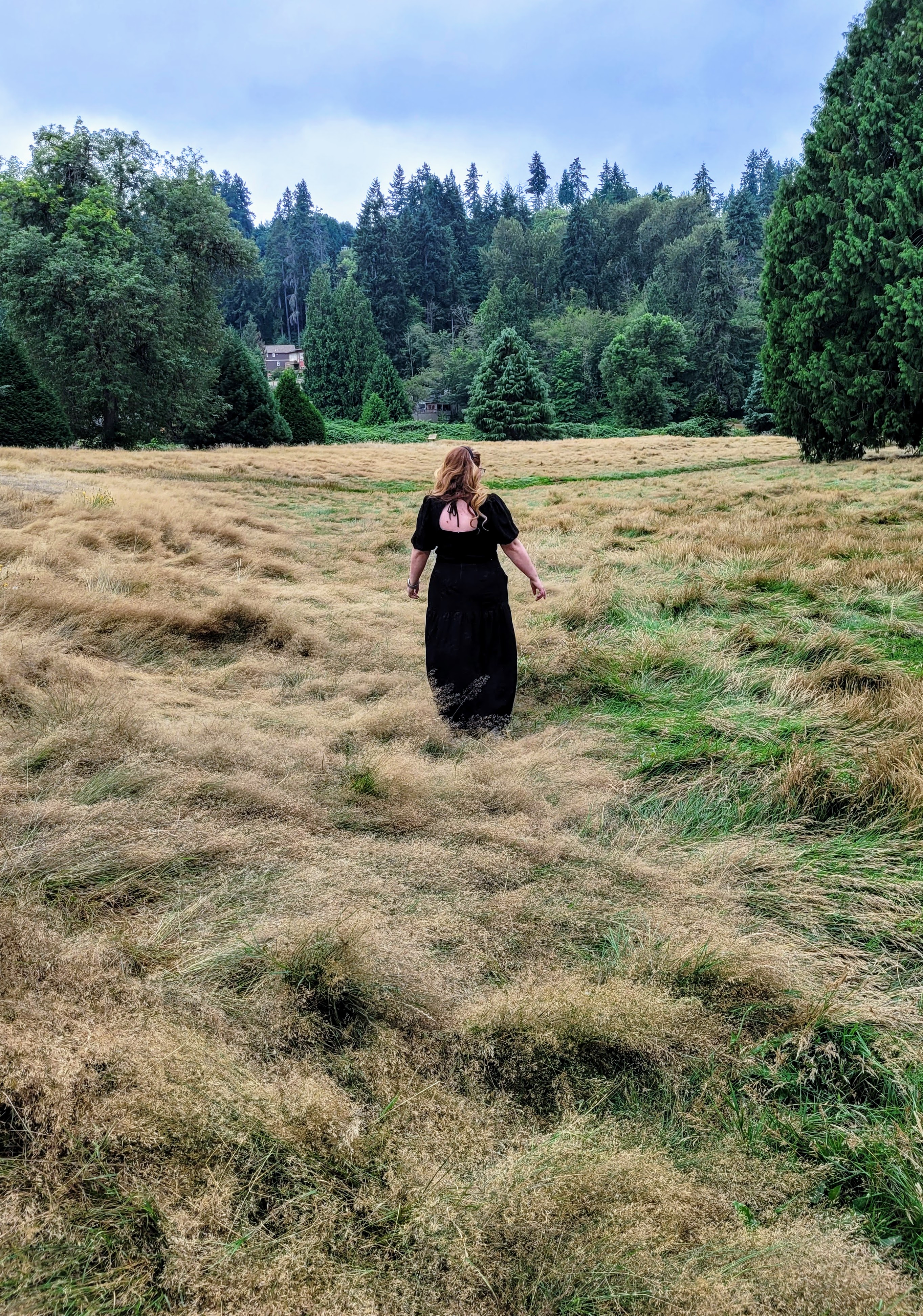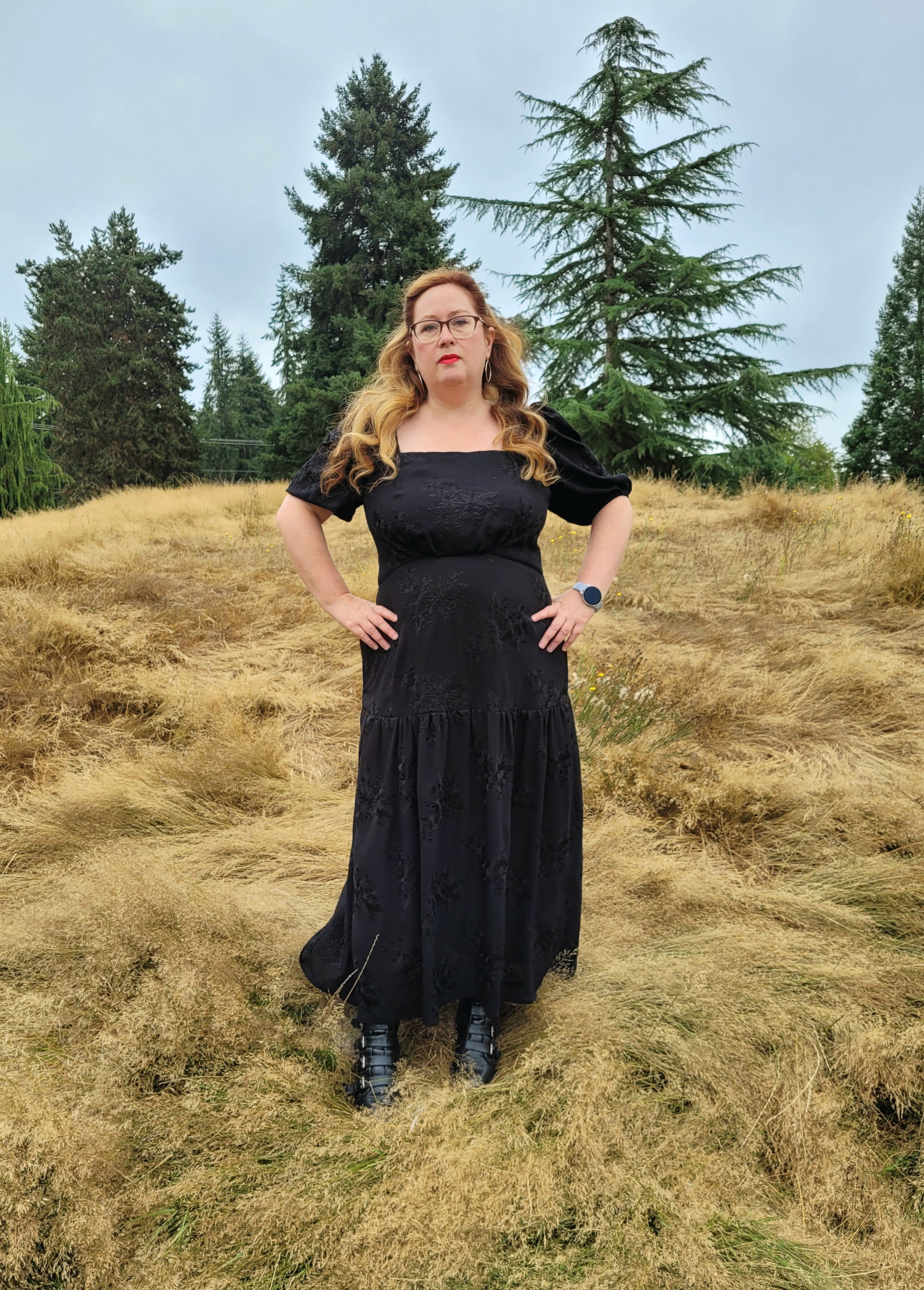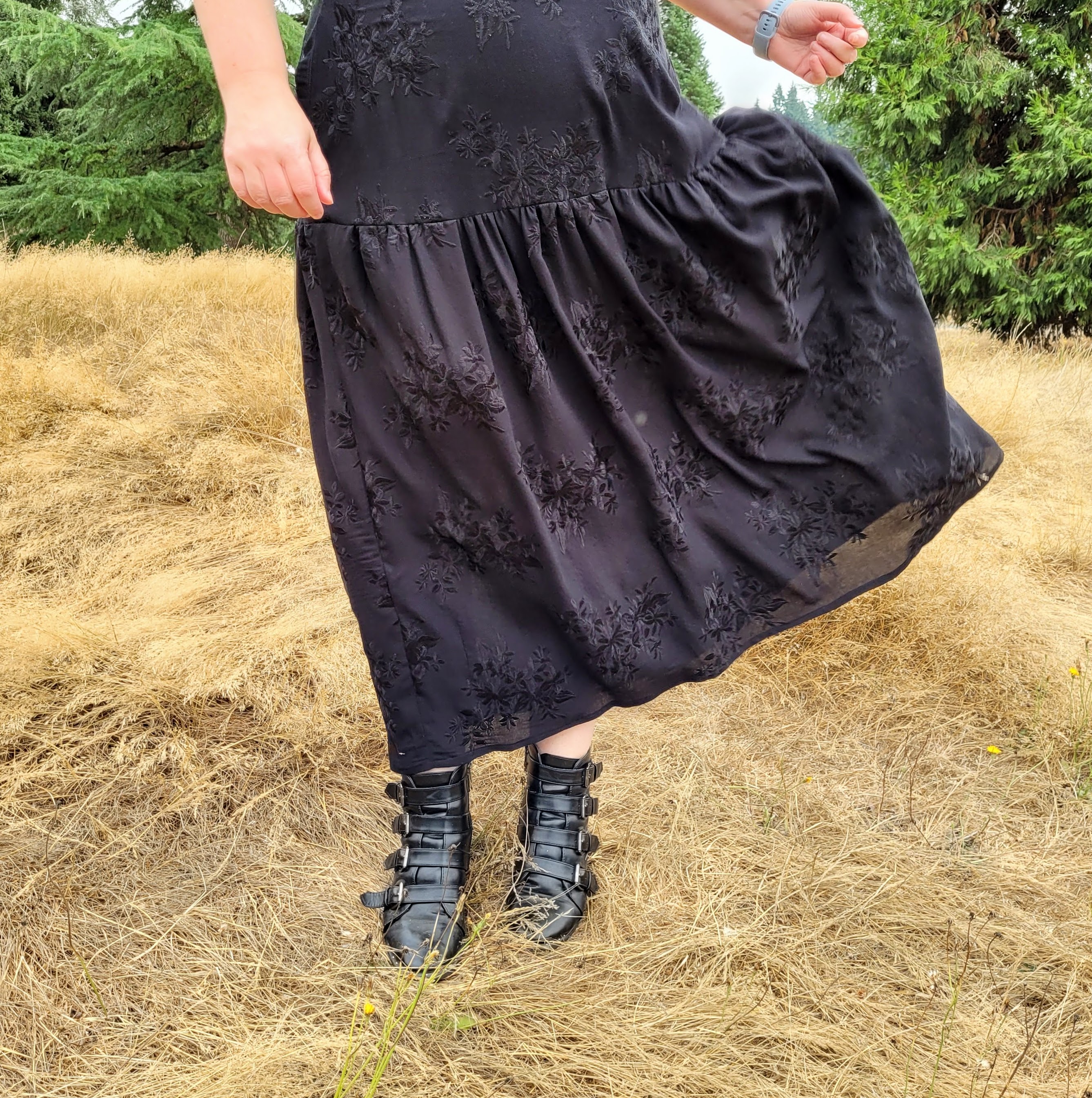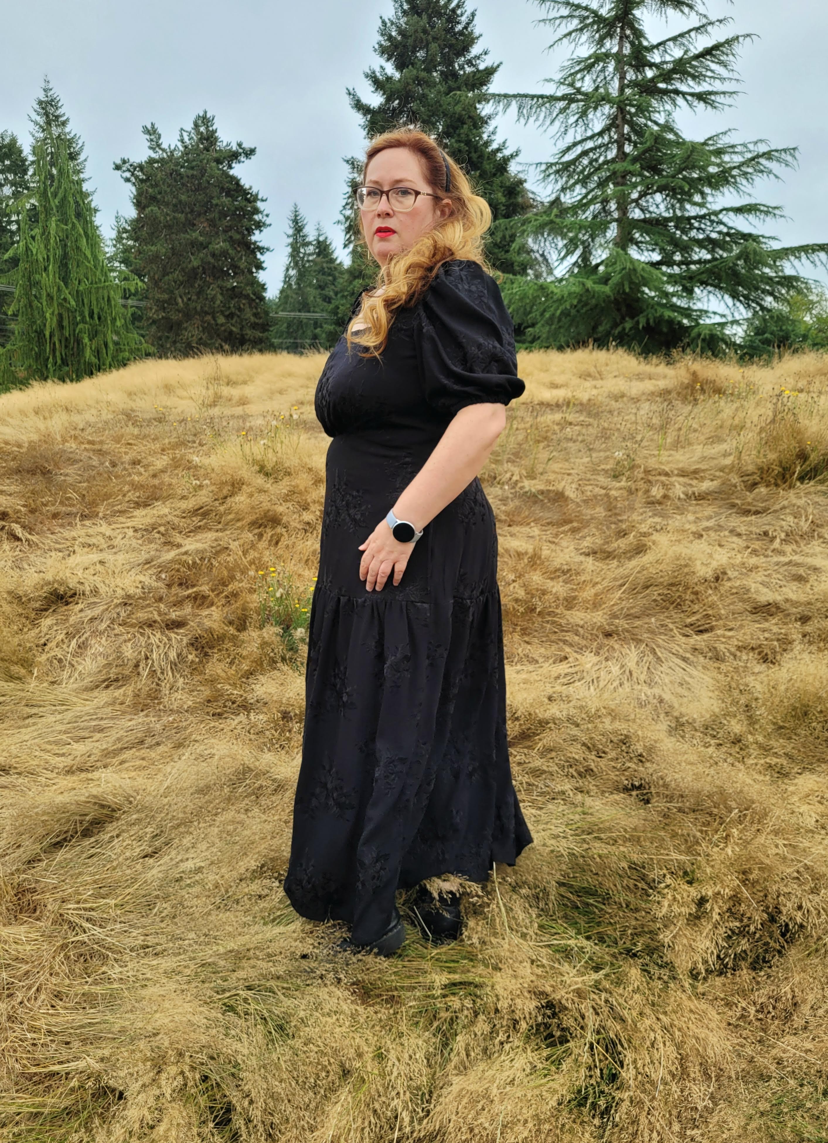 Nevertheless, there’s no denying this is a romantic statement of a design and I went through my fabric collection several times, choosing things, putting them back, trying other things and just could not decide on something. Everything seemed either too girly, or the wrong drape or colour. Then I happened to see some new fabric from one of my favourite small deadstock stores: L’Etoffe Fabrics, based out of San Diego. Ina has such a great eye and always has something interesting arriving in her online shop. This black embroidered crepe was beautiful, there was only one piece of it, and I immediately thought, “Oooohhh, a BLACK summer dress?” Why not? Add a little edge to the romance? In my head I had some sort of Spanish-influenced thing going on, but I think the final reality has more of a Wuthering Heights vibe happening. To top it off, my local park where we walk the doggy even has a vaguely moors-like feel to it at the moment, so it’s perfect! (Heathcliff took the photos and he fulfilled the grumpy partner role wonderfully. Lol.)