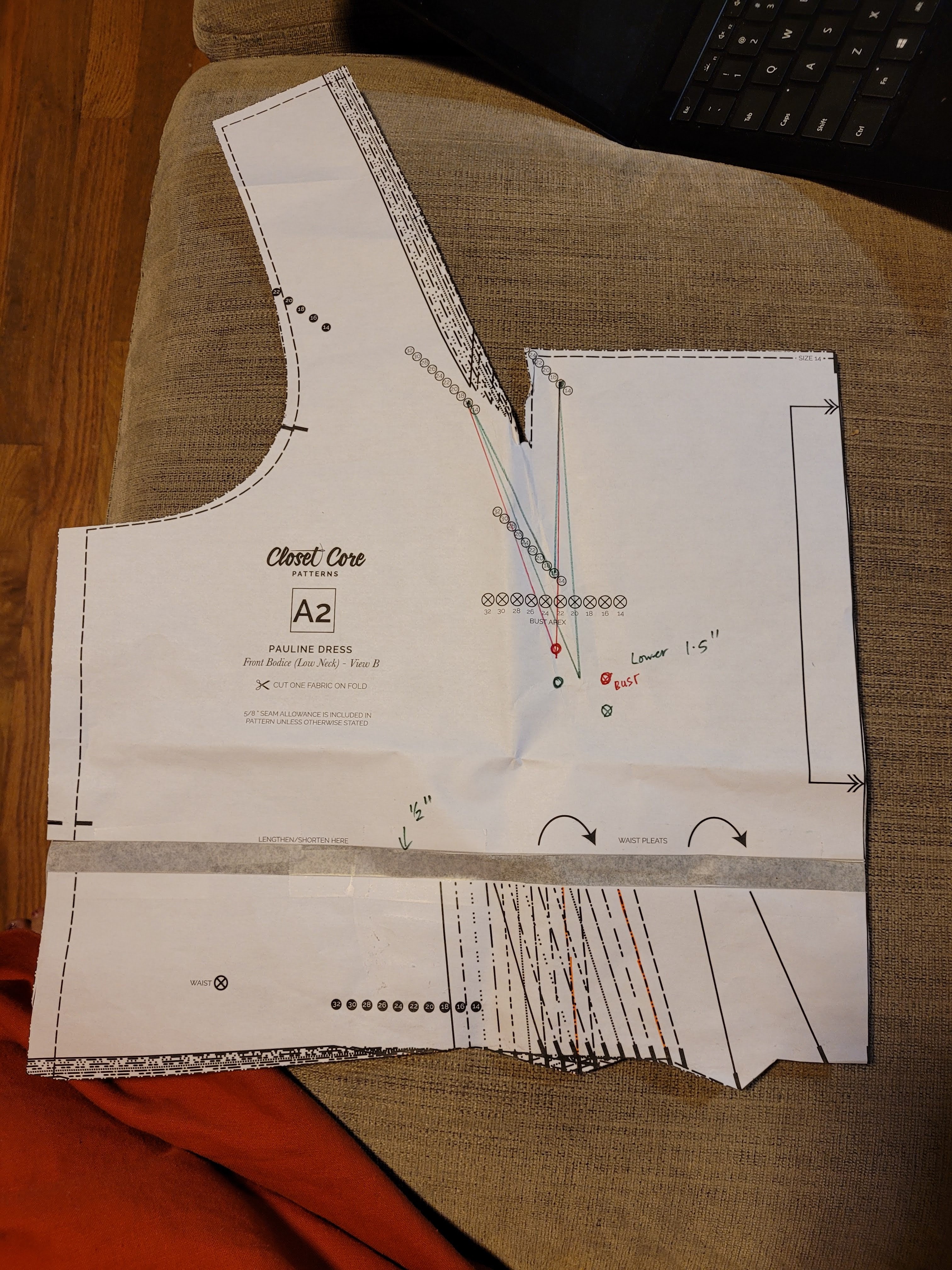 I also made some changes to the bust and waist area. My apex is a bit lower and a bit further towards the centre of my body than Closet Core drafts the D cup for, so I made some adjustments to that area. The darts are pretty cool since they’re integrated into the strap, which I hadn’t seen before, but the process was much the same and worked well (ignore the fact there are two different adjustments – I redid it and used the red one). As you can see, one further change I made was to lengthen the waist by half an inch as it was sitting a little above my natural waist. I would say this is a very personal adjustment, as I’m quite long in that area, but I’d watch for the apex point if you tend to find a lot of patterns draft them high for you.