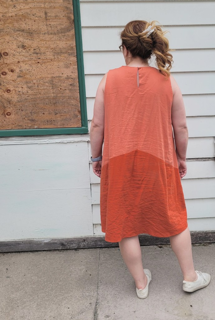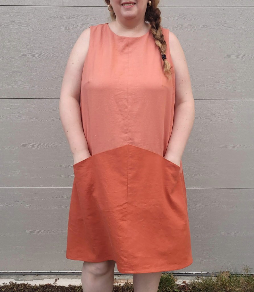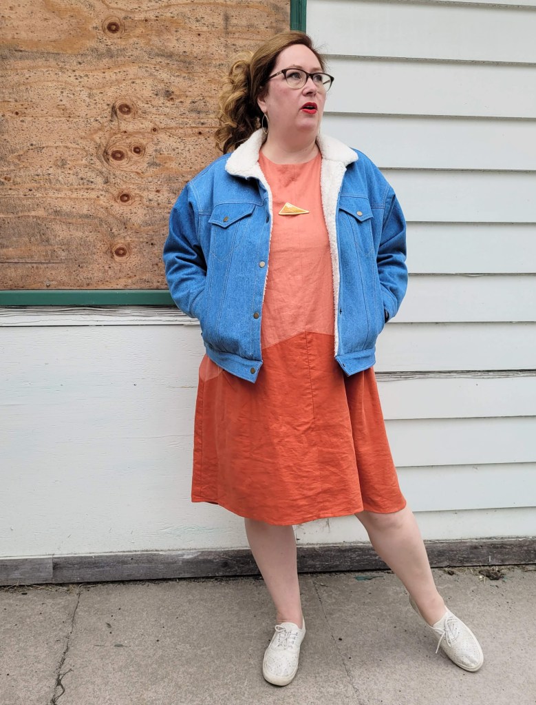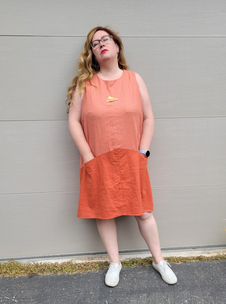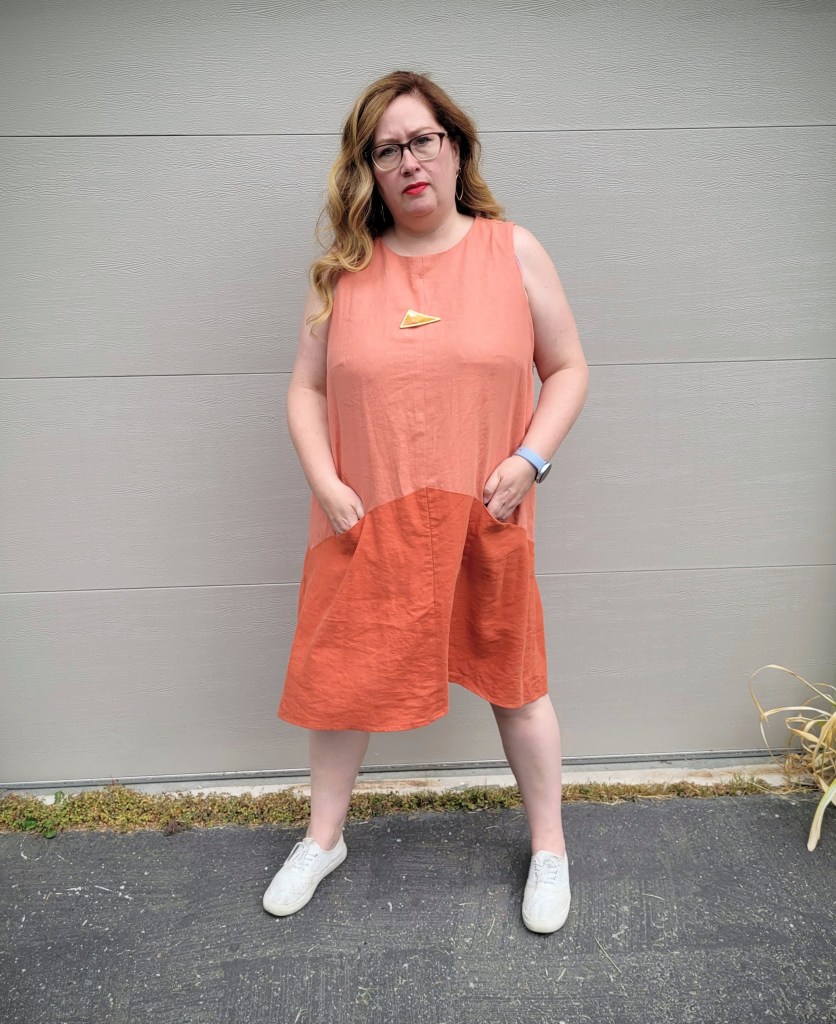 I decided to colour block with two pieces of linen I had left over from other projects. I put them together and really liked the colour contrast, so decided to go with it. These are actually colours that I wouldn’t tend to pick out against my skin tone. I’m not sure what was going on in my mind when I bought them, although I suspect it was around the time everyone was making earth-tone clothes (and still are to some extent) and I was swept along with the trend. Anyway, for a project that comprises a garment I wasn’t sure about in fabrics I wasn’t sure about, I think it turned out pretty well, haha!