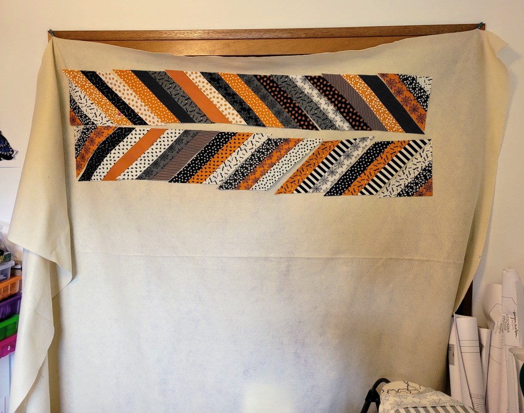 I was sold, so I bought the jelly roll and proceeded to make it up. I wanted the quilt to have a random scrappy feel and realised about halfway through piecing that it was probably about time for a makeshift design wall. I really need one for another quilt I’m working on, and this gave me the final push. Off I went to Joann, where I bought 3 yards of extra wide felt in a sale for $3.99/yard and I hooked it up on my wardrobe when I got home. INSTANT DESIGN WALL! Actually, I think I’ll put the felt on some backing board at some point so I can move it around, but I’m quite chuffed with it nonetheless and it totally feels like grown-up fuzzy felt.