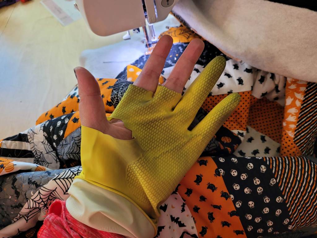 Another thing I figured out was that the need for quilting gloves was real. I had some household latex gloves in the kitchen, so snipped off the thumb and a couple of fingers and – voila – my own budget version! They worked pretty well. That minky didn’t half rub off on them though!