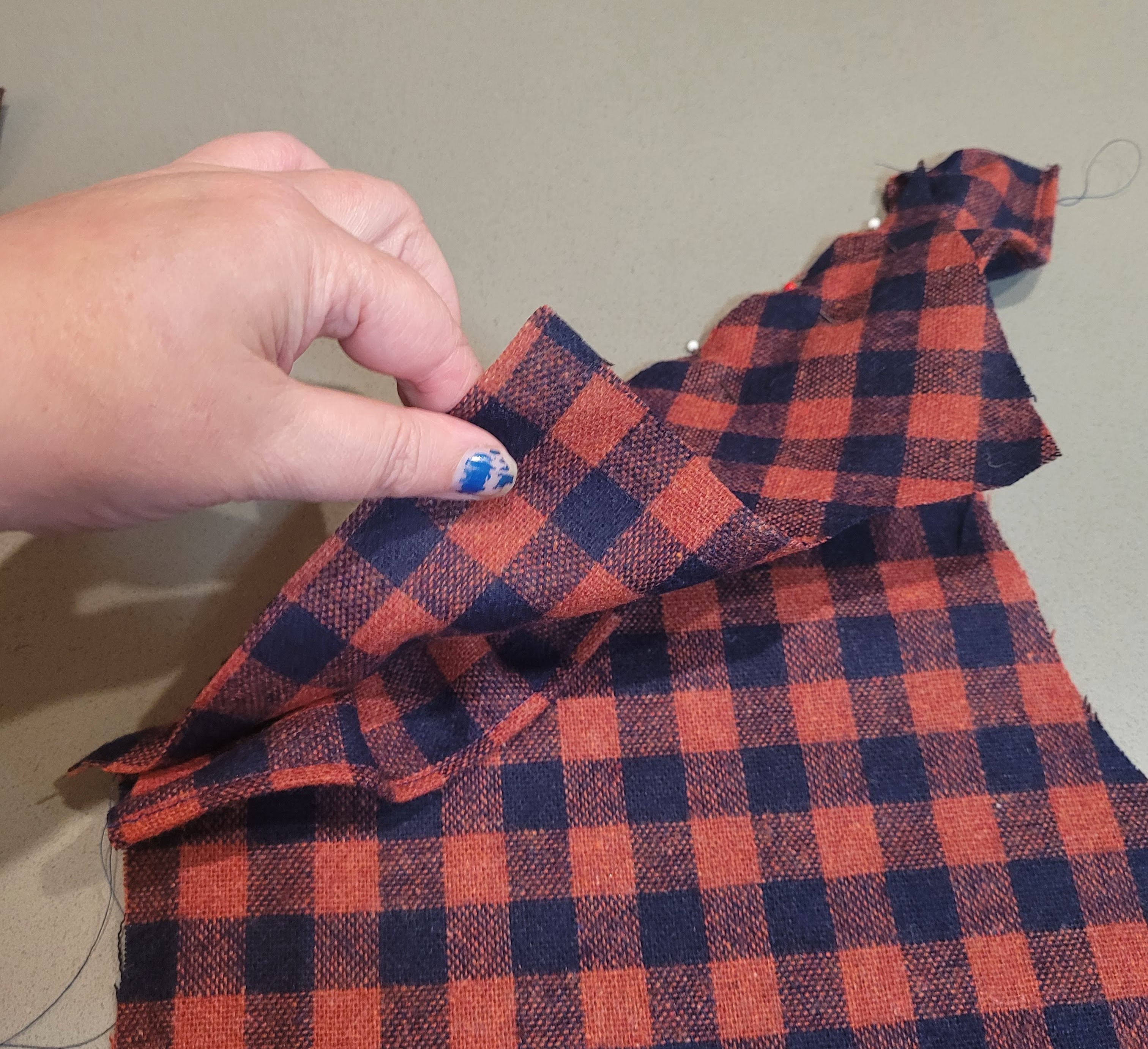 I checked it looked okay and then placed the little diagonal top piece right side down on top of the ruffle and stitched all layers together at the 5/8″ seam allowance.