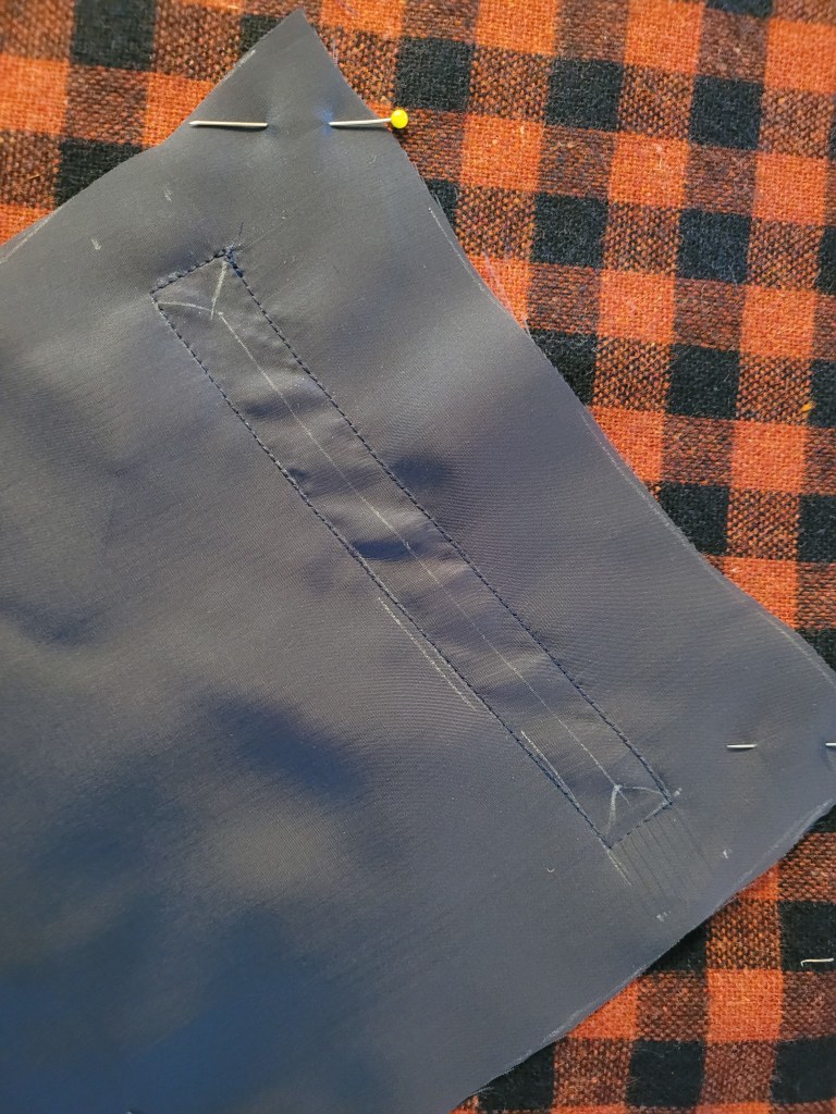 2. Mark the opening on your pocket location and the pocket piece. Lay the pocket piece RST with the jacket front so that the two rectangles match up and stitch around the entire rectangle.