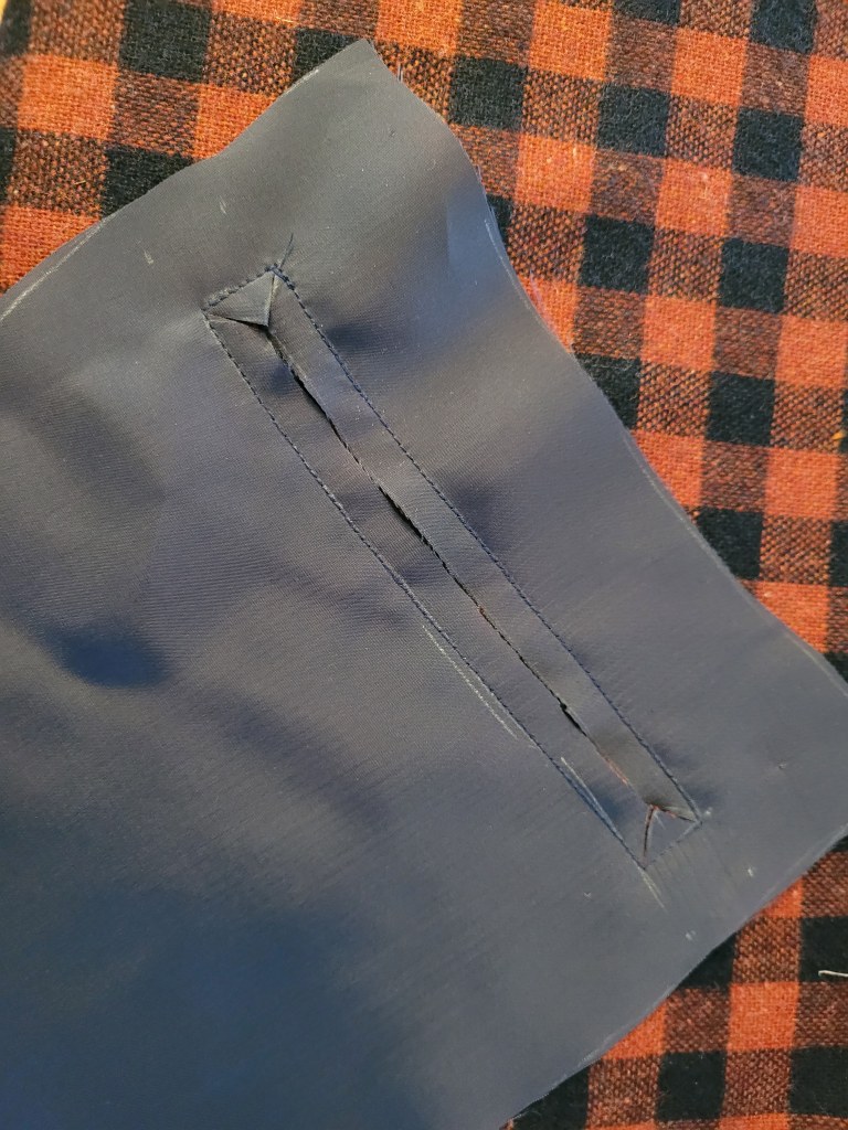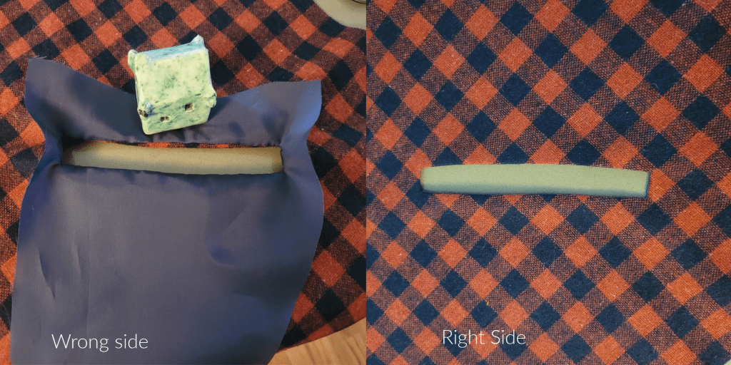 4. Push your entire pocket piece through the hole to the wrong side of your jacket front and flatten so you get a nice rectangle on the right side. Press well on both sides.