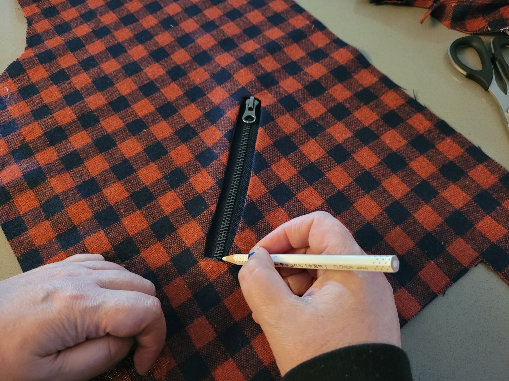 1. First, decide on your pocket length. My zipper was quite chunky, so I decided to lengthen the pocket by about 3/4″. You can totally use the pattern length though – whatever you prefer. The width of the welt opening was fine for my zipper as I wanted the exposed look with a thicker zipper. If you prefer a thinner zipper or sleeker look, you will want to narrow it.