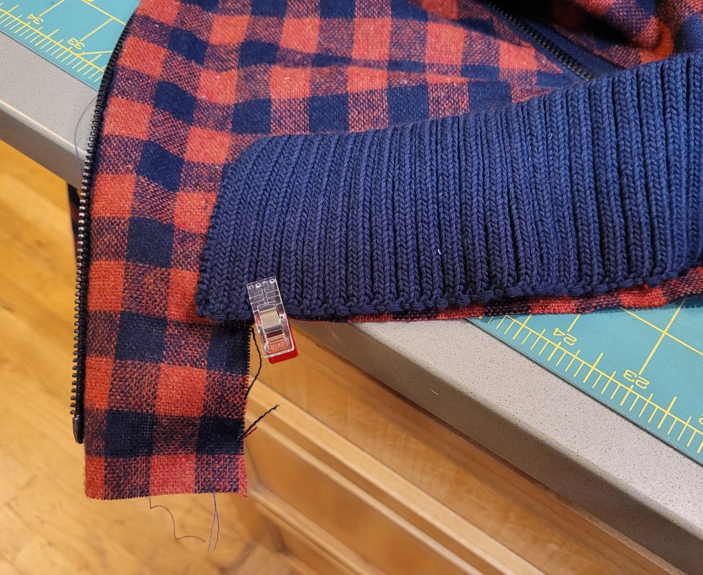 Seamwork describes the Larkin thus: The Larkin has “a classic, relaxed fit throughout and all the details you want in a bomber. There is ribbing at the neckline, cuffs, and hemline, as well as an exposed center front zipper, welt pockets, and topstitching all over”. Indeed, this is a classic bomber jacket and, interestingly, both patterns this month are gender-inclusive; the other being the Ryan tee. I like the cut-out ribbing at the waist as a design detail and actually that the shoulders are pretty standard and not super dropped or raglan.